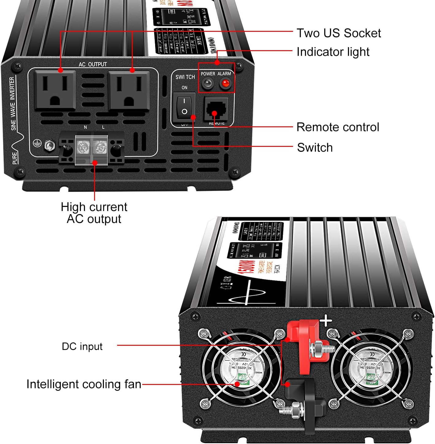- [LCD Display and remote control] Input voltage ,Output voltage.Easily to watch the voltage so that you can know the using status of your battery.Inverter with remote control: The cable is 5 meter long, and the long cable will help you easily control the on/off of the inverter.