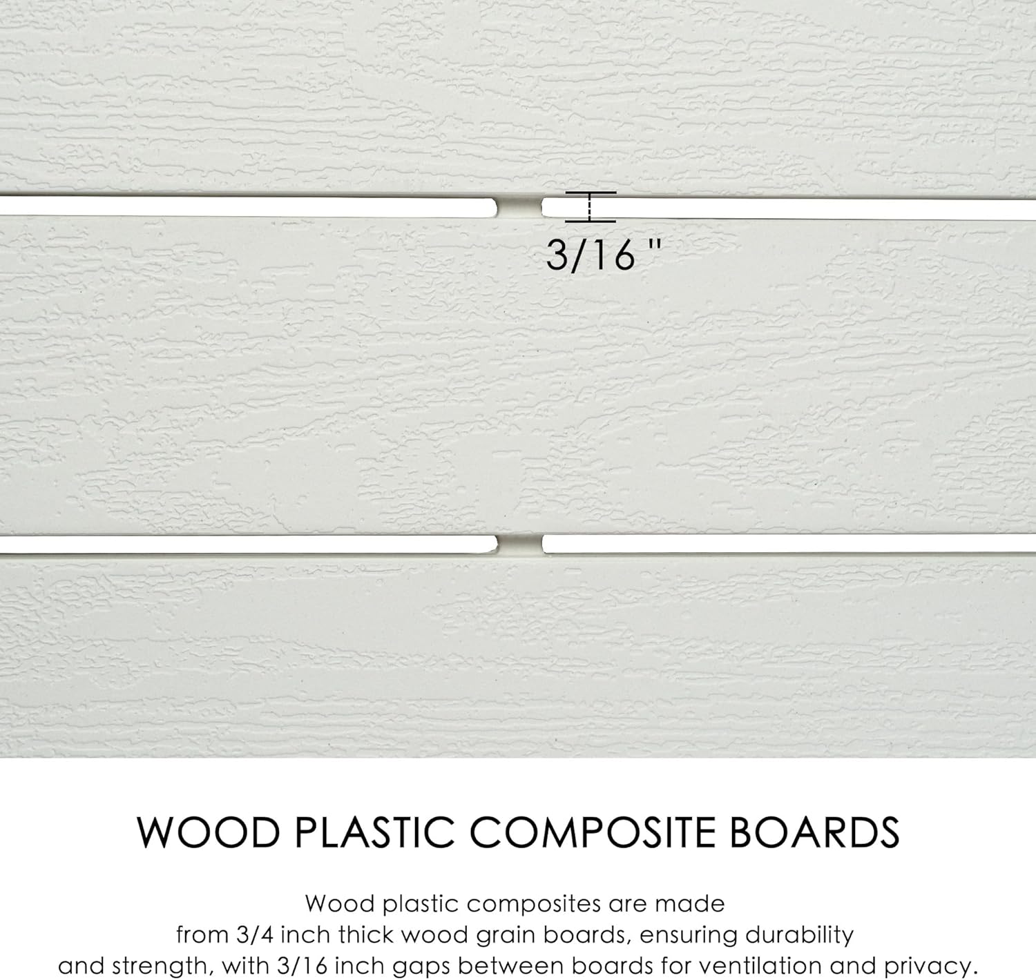 - š” High-Quality Material: Our outdoor privacy screens are crafted from medium-density polyethylene, designed with a wood-like appearance that is more resistant to water and corrosion than cast iron. The 3/16-inch gaps between the boards provide ventilation while maintaining privacy. The smooth surface resists dust and stains, and the simple white color complements any setting.