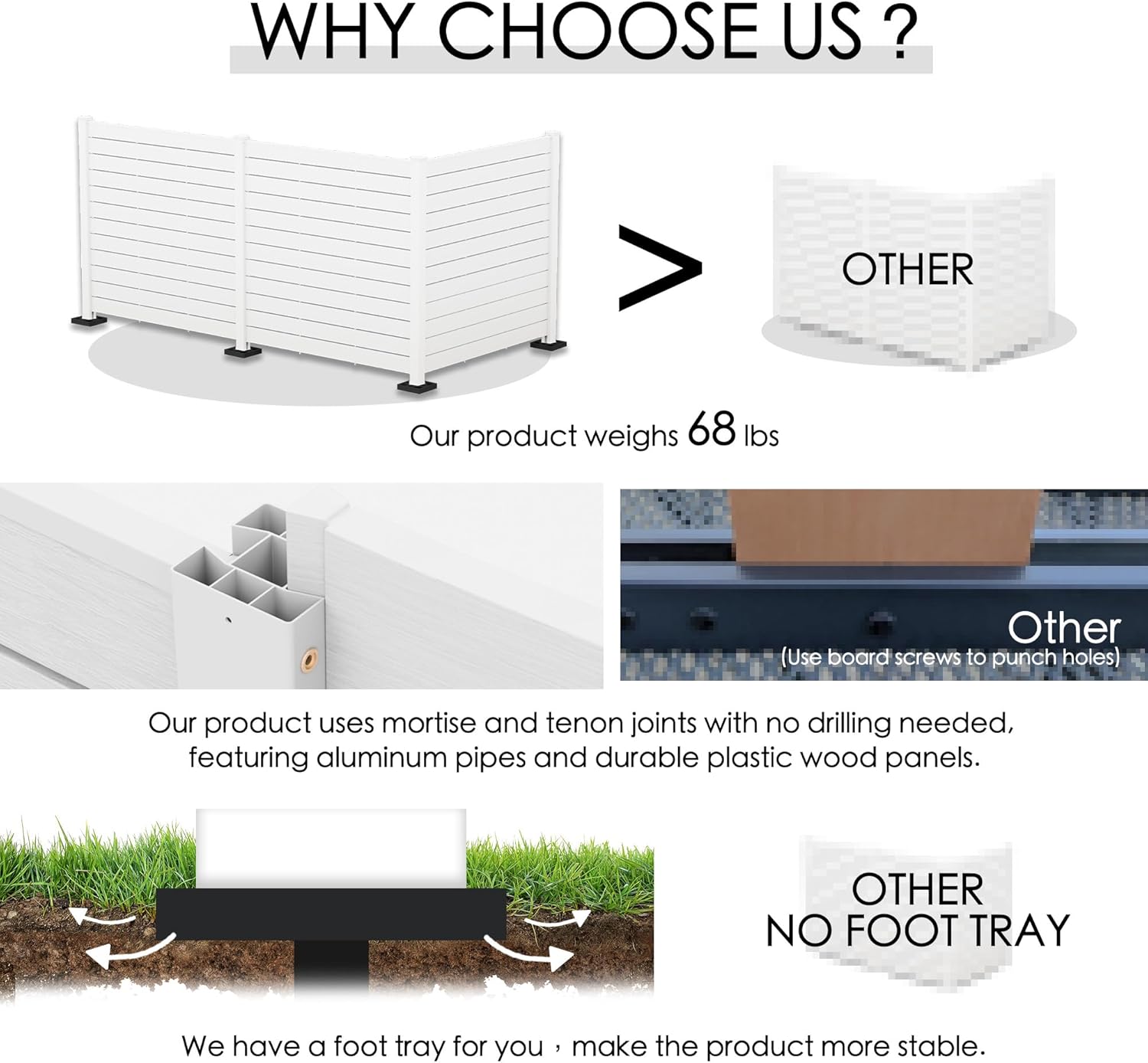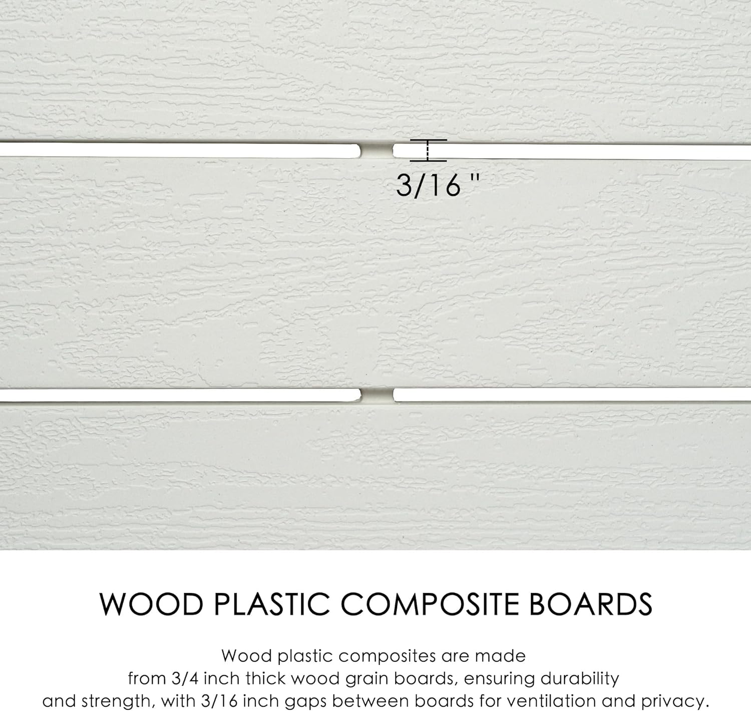 - š” High-Quality Material: Our outdoor privacy screens are crafted from medium-density polyethylene, designed with a wood-like appearance that is more resistant to water and corrosion than cast iron. The 3/16-inch gaps between the boards provide ventilation while maintaining privacy. The smooth surface resists dust and stains, and the simple white color complements any setting.