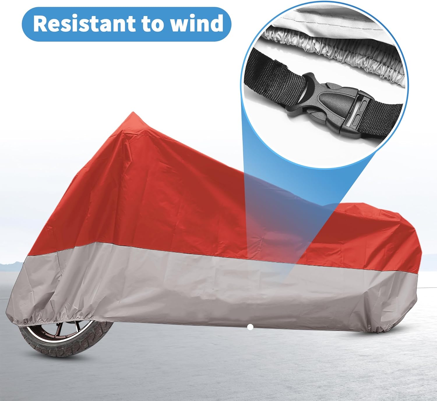 - Waterproof Windproof Upgrade: The motorcycle cover is made from 190T polyester, with the seam applied with PU glue, so it is rainstorm-proof. Adjustable Elastic Band at the lower hem of the cover can press the cover against the motorcycle body closely. In addition, there is a buckle at the bottom to prevent the cover from being blown away.