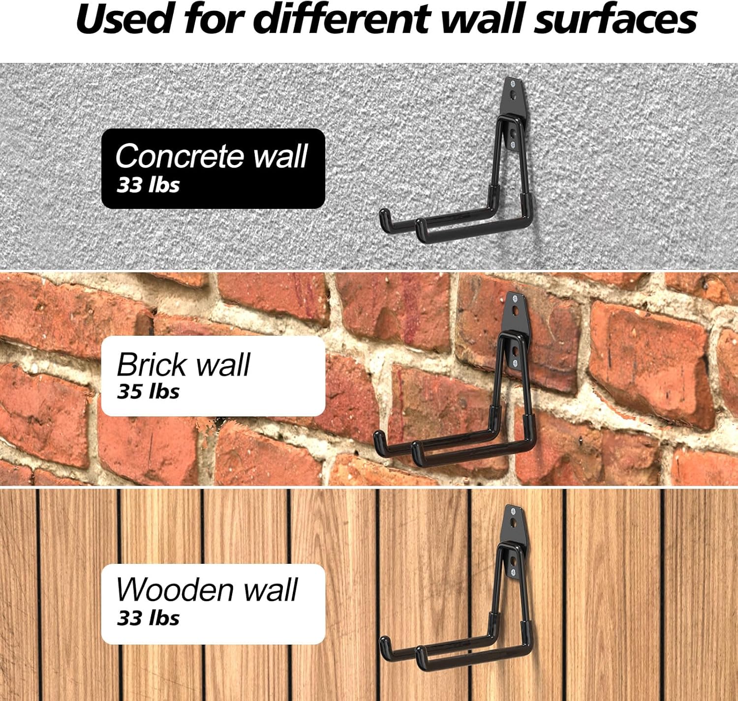 - SIMPLE INSTALLATION:The garage wall hook is equipped with two types of screws and an operating manual. Can be installed on wooden walls, concrete walls, and gypsum walls. The load-bearing capacity of each wall is different