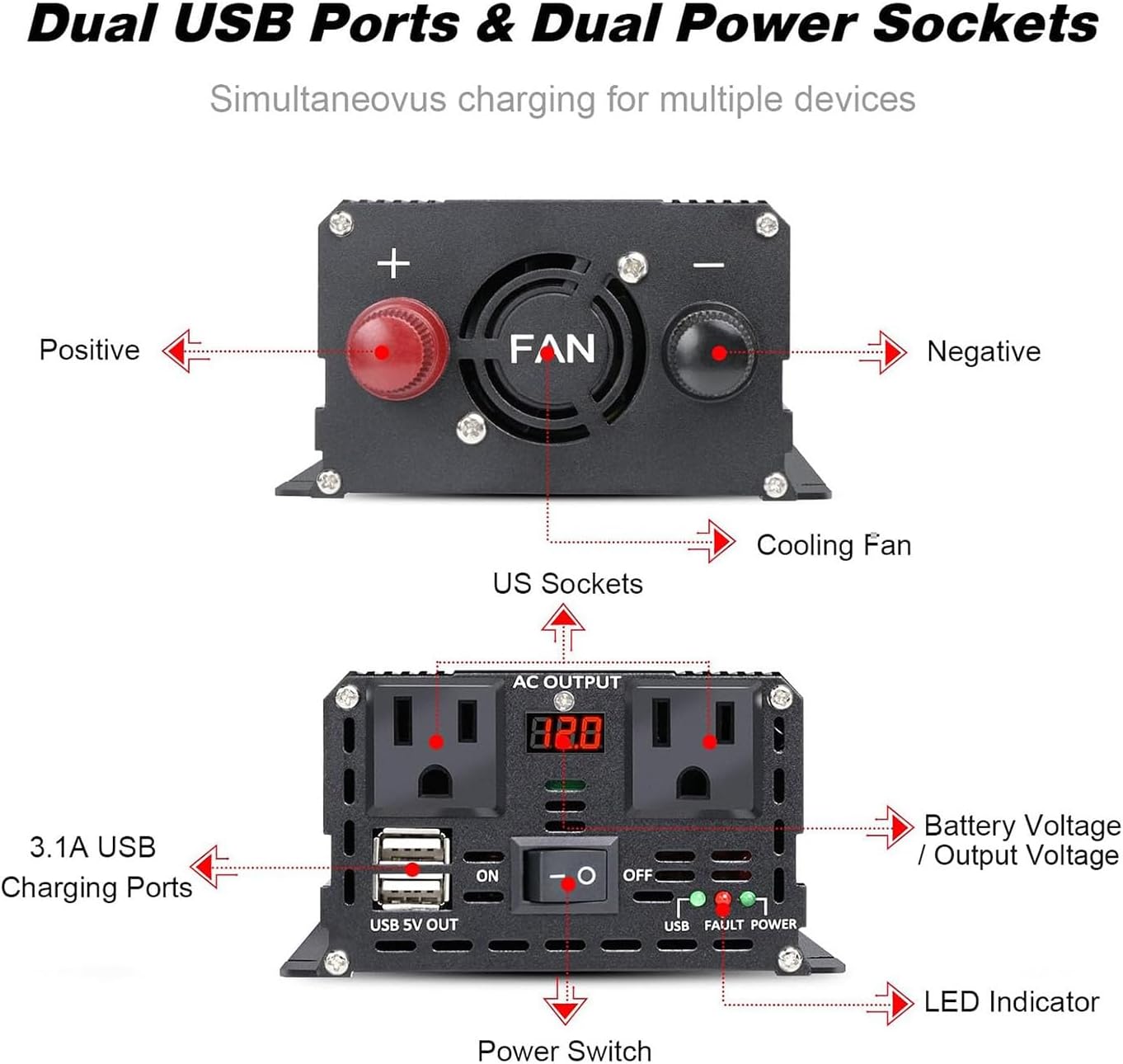 - HIGH QUALITY PURE SINE WAVE OUTPUT: LVYUAN Power Inverter provides continuous and stable 500W pure sine wave power, 1000W peak power with 2 AC outlets, 2 USB ports, easy to power multiple devices at the same time