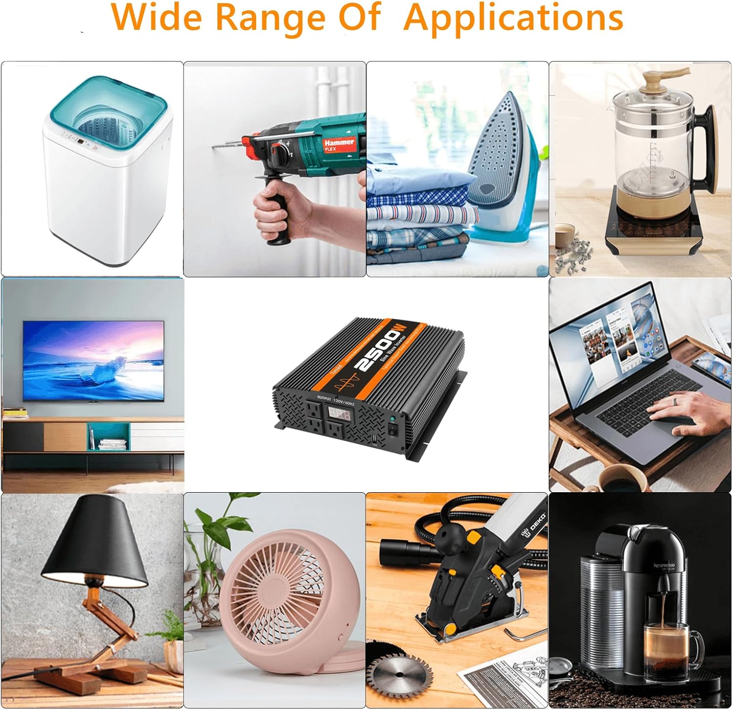 - 3.[Wide application ]:With advanced pure sine wave technology, the 2500W inverter provides stable quality current to your electronics and home appliances. Run equipment just as smoothly, no strange buzzing sounds when your electronics are turned on. More electrical power outlets allow more of your machines to get the power supply with no limits,no matter resistive loads or inductive loads. Ideal used in your car ,Truck, semi truck, off-grid Solar panels, various vehicles , outdoor-field works ,camping ,power outage ,emergency and where power to be needed.