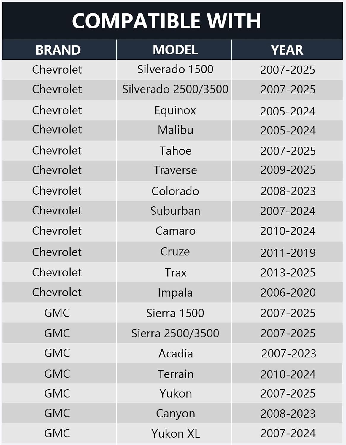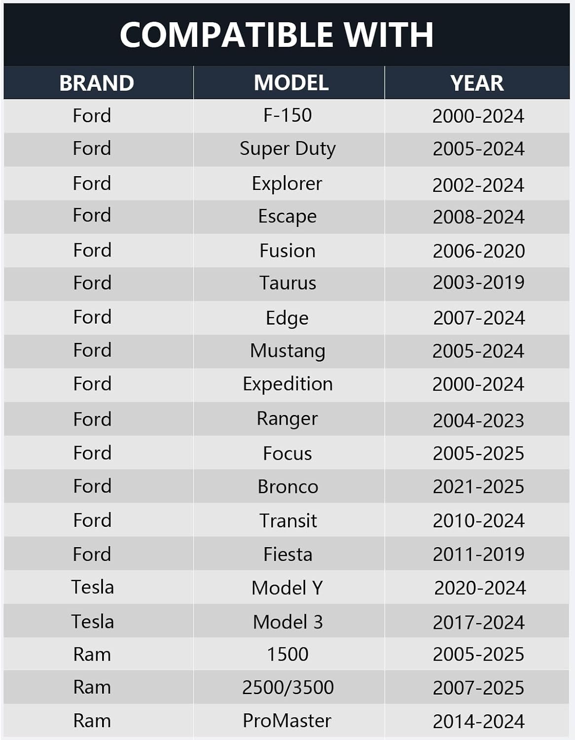 - Suitable: Compatible with Ford F-150, Super Duty, Explorer, Escape, Fusion, Taurus, Edge, Mustang, Expedition, Ranger, Focus, Bronco, Transit, Fiesta; Tesla Model Y, Model 3; Ram 1500/2500/3500, ProMaster; Chevrolet Silverado 1500/2500/3500, Equinox, Malibu, Tahoe, Traverse, Colorado, Suburban, Camaro, Cruze, Trax, Impala; GMC Sierra 1500/2500/3500, Acadia, Terrain, Yukon, Canyon, Yukon XL
