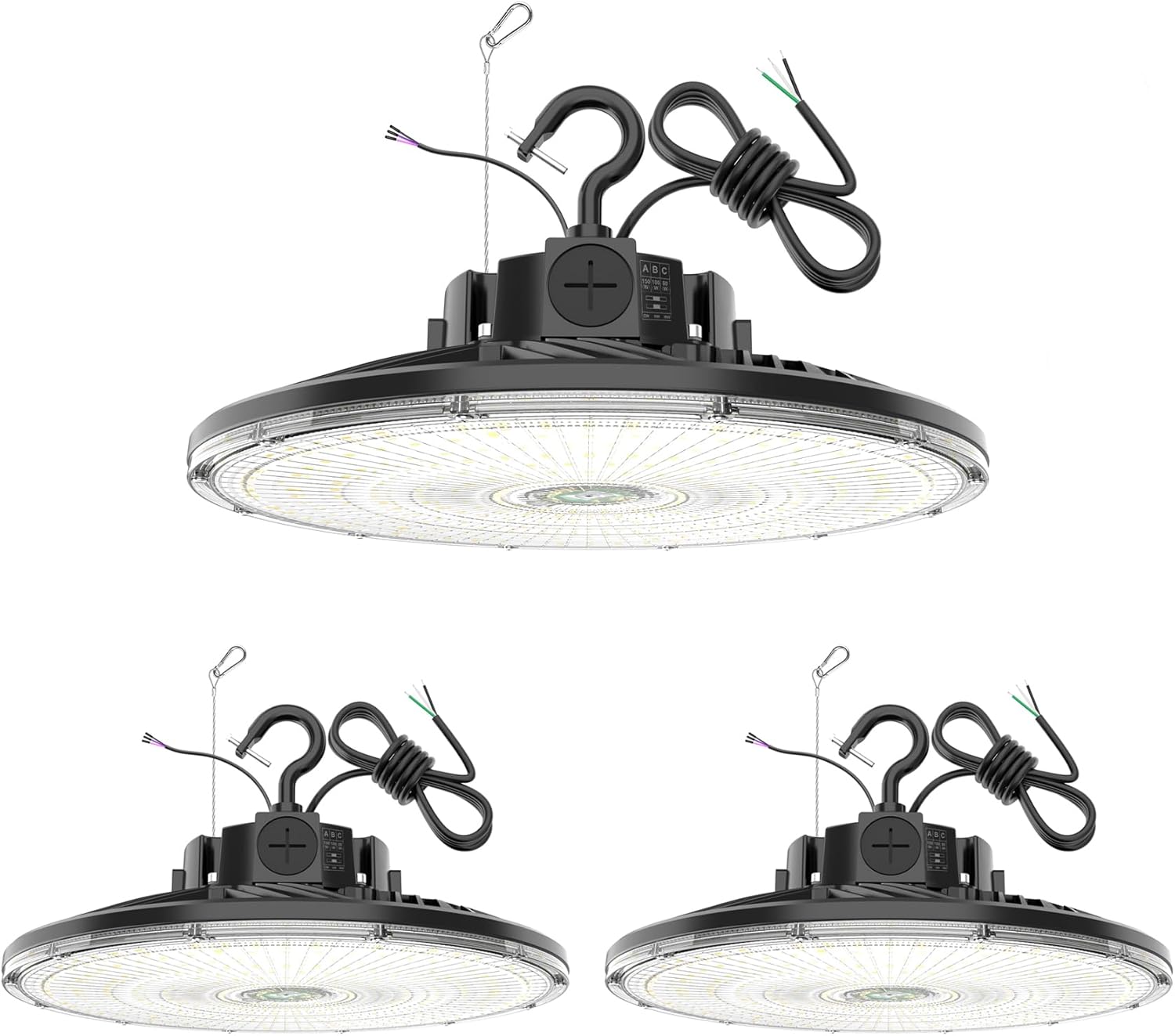 - 【3 Wattage Selectable】Using our led high bay light is equivalent to having 3 brightness LED lights 240W/200W/150W, which is equivalent to providing 33,600 lumens/28,000 lumens/21,000 lumens. Simply slide the switch to select the perfect wattage and color temperature before installation to meet your different needs in warehouse, workshop, factory, garage, barn and other industrial and commercial places.