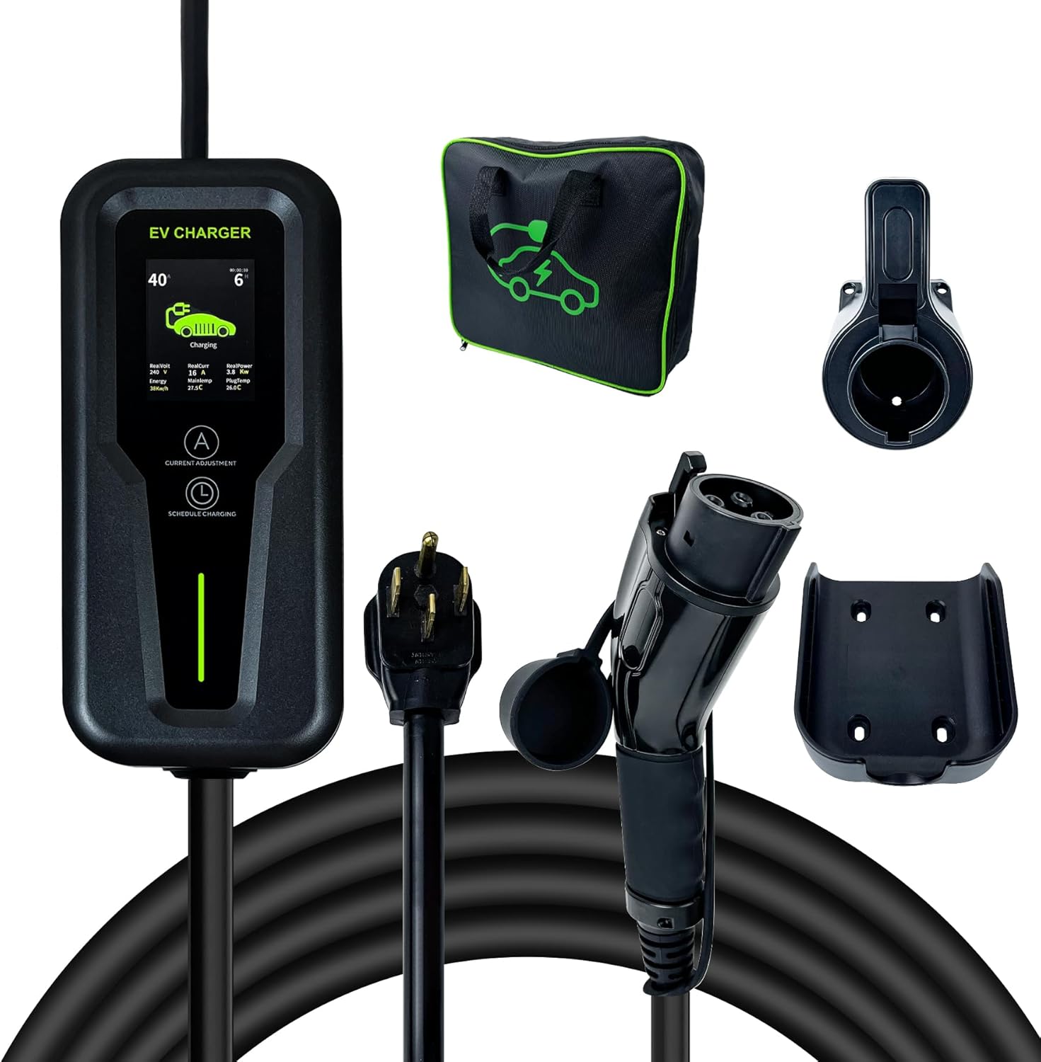 - 【Convenient Design】Our Level 2 EV Charger comes with a hook, stand, carrying case and manual. The carrying case is designed to be conveniently placed in your home or car. Charge your car anytime, anywhere. The hook and base design ensures stability and flexibility when using the charger and allows you to utilize the hook and base for different charging environments