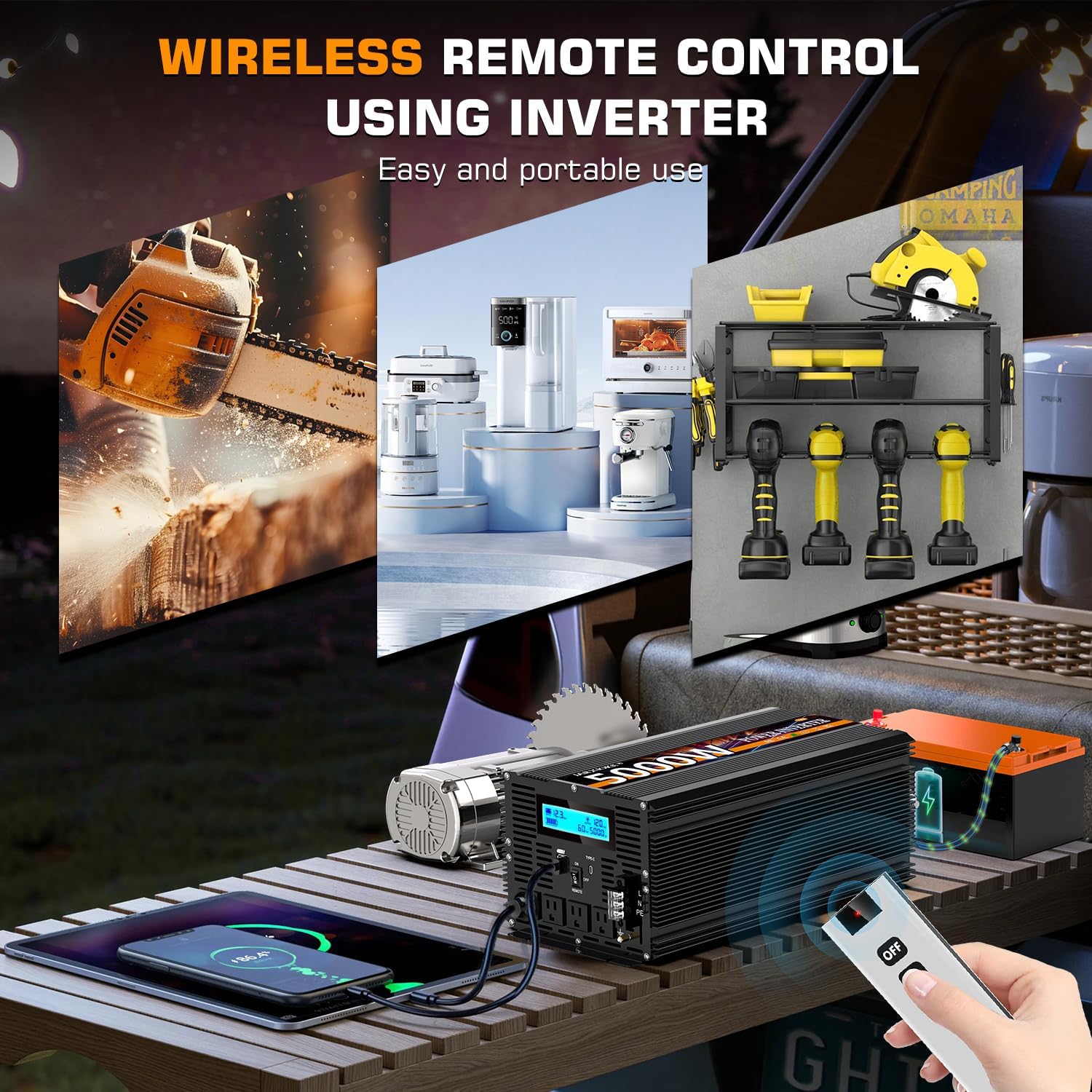 - ☀ This is a 12 volt 5000 watt modified wave inverter DC 12v to AC 110V/120V. Perfect for traveling, camping, tents, boat trips, working on the road, and anywhere without electricity! Just connect the power inverter to the battery and then to the device.