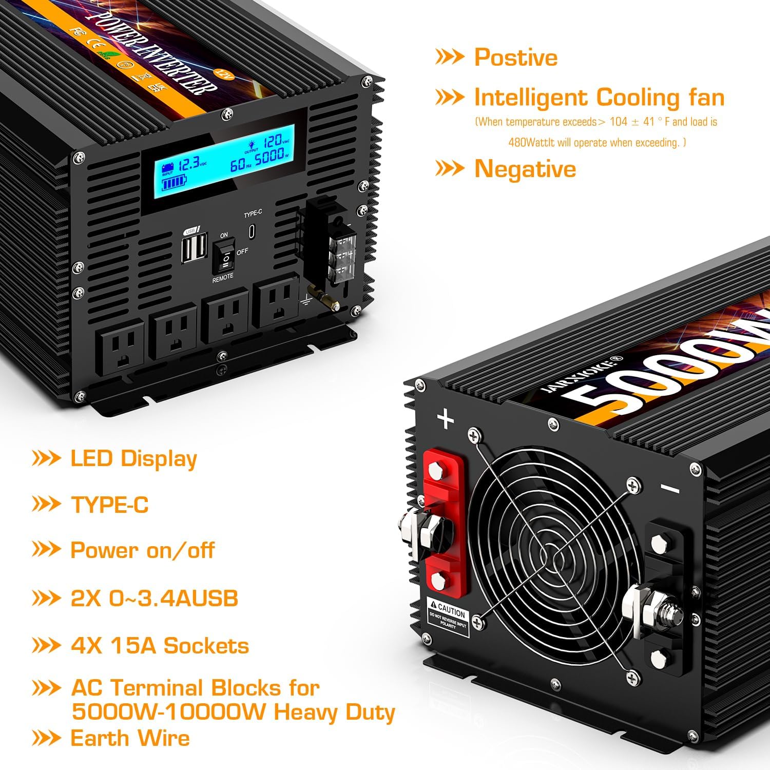 5000 Watt Power Inverter 12V DC to 110V 120V Converter for Family RV Off Grid Solar System Car with Type-C Ports 3 AC Power Outlets Dual USB Ports LCD Display Wireless Remote Control