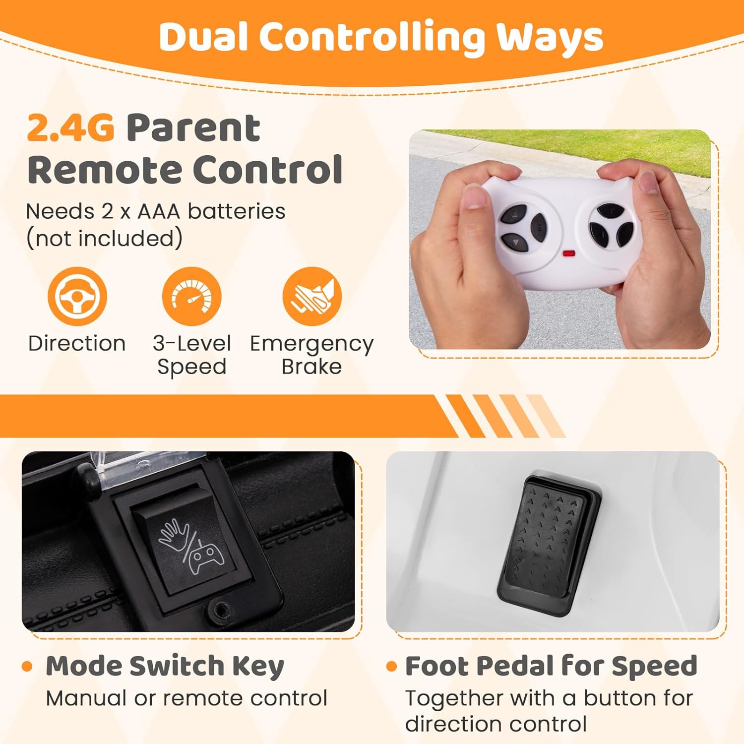 - Remote or Manual Control: The 12V ride on toy features a 2.4G parent remote control to ensure full direction control, 3 speeds of 0.6-3.1 MPH, and an emergency brake. With a mode switch key, it also supports the manual driving for 2 speeds of 1.2-3.1 MPH.