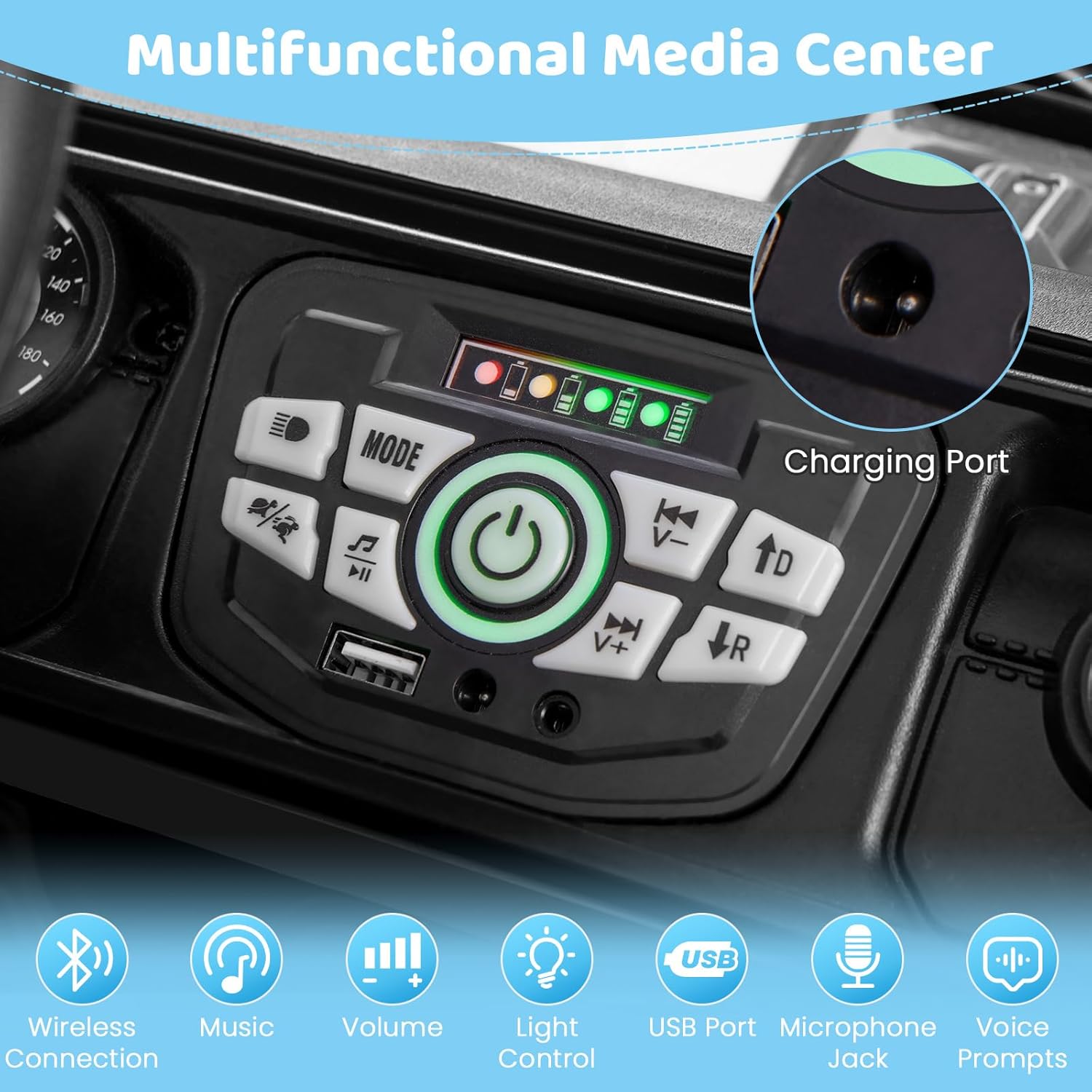 - Multimedia Functionality: The kids electric car boasts voice prompts and a smart wireless connection, complete with volume control and a USB port for personal playlists. Add to that a microphone jack for budding performers and light control for dynamic rides.