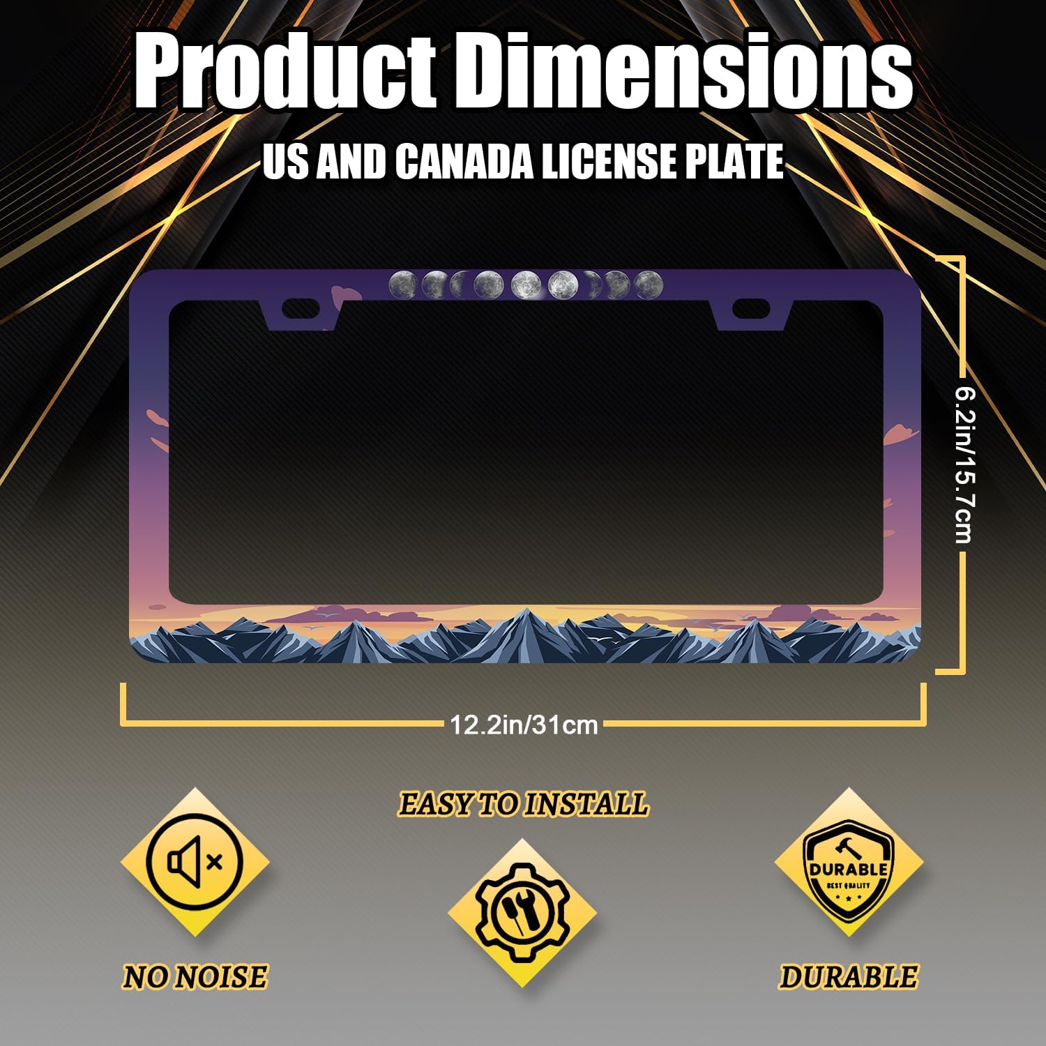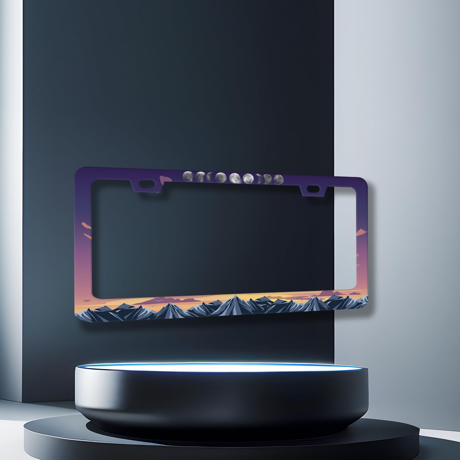 Moon Phase License Plate Frame Mountain Night Stars License Plate Holder Front and Rear Car Tags Stainless Steel Auto Parts Funny License Plate Decoration with Screws Men Women 12.2"x 6.2"