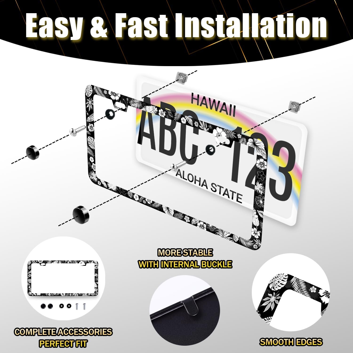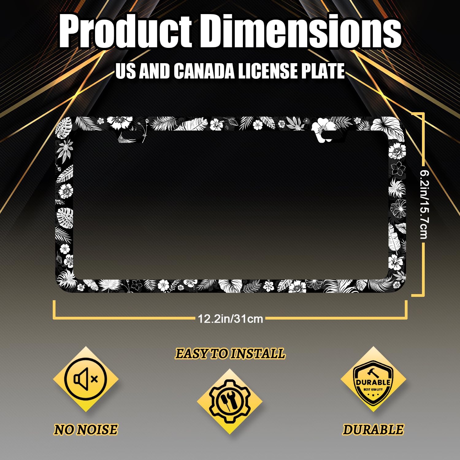 Tropical Flowers Leaves License Plate Frame Hawaiian Hibicus License Plate Holder Stainless Steel Front and Rear Car Tags Auto Parts Colorful License Plate Women Decoration with Screws 12.2" x 6.2"
