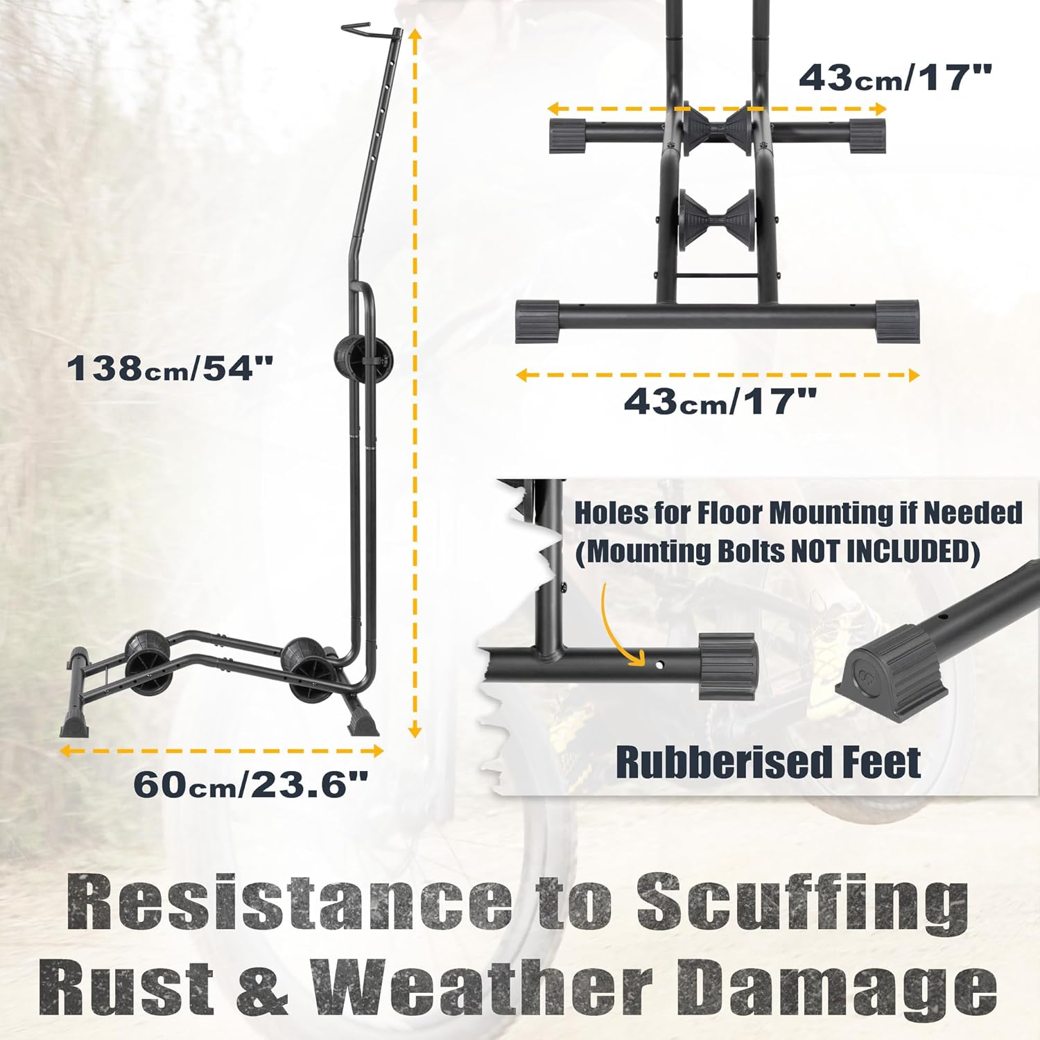 - PREMIUM QUALITY - Crafted from robust steel with an exceptional powder-coated finish, our vertical bike rack is built to resist scuffing, rust, and harsh weather conditions. The bicycle rack's rubberized base and feet offer additional protection to your bike and your flooring. ORDER NOW, WORRY-FREE, you can purchase with peace of mind, backed by a LIFETIME warranty.