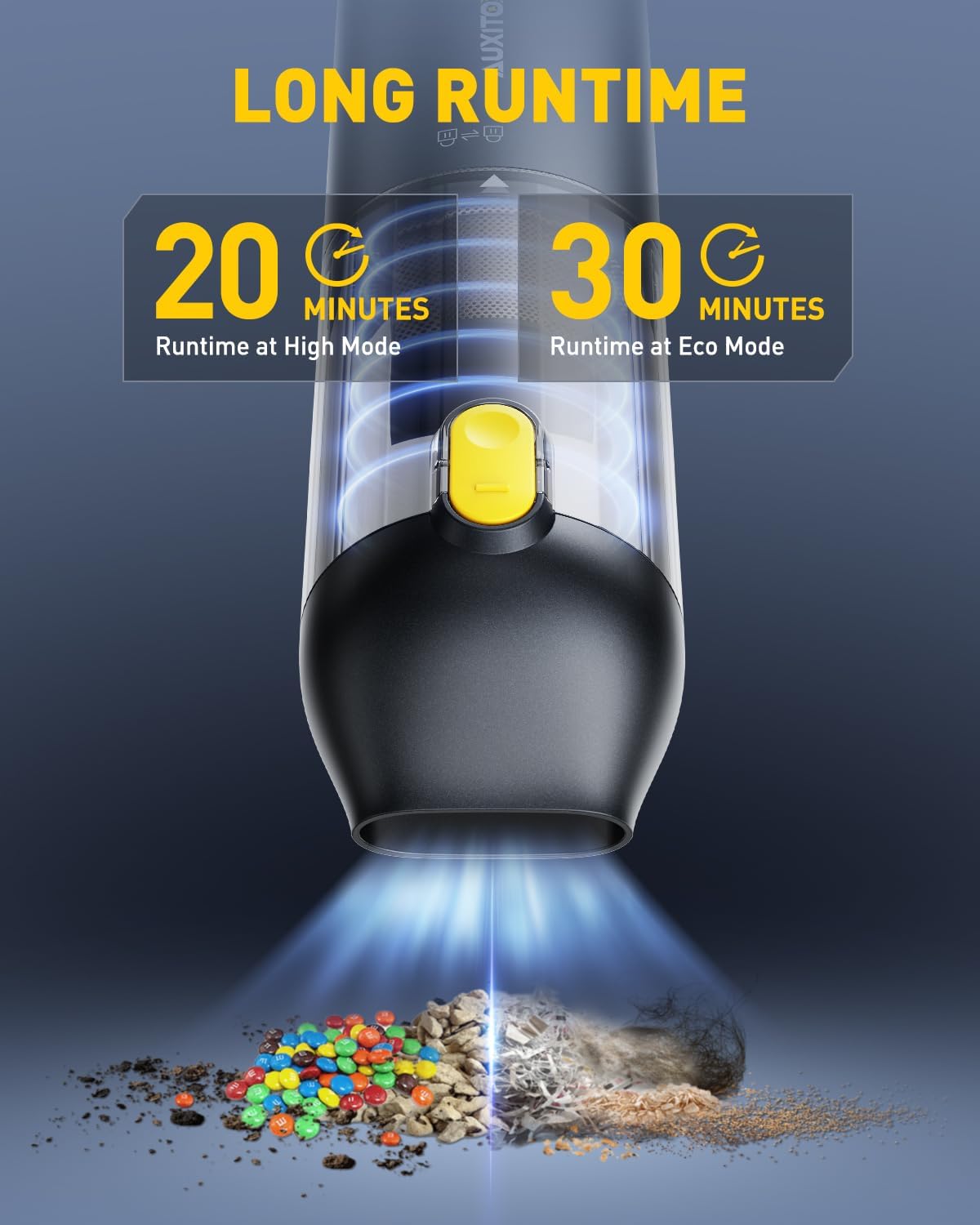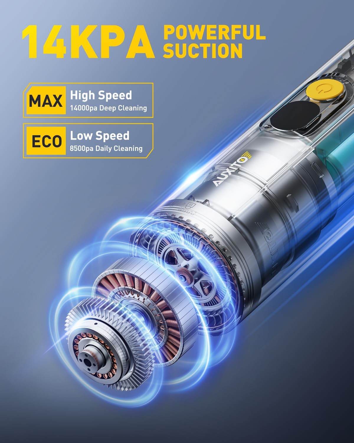 - ă14000PA HIGH POWER SUCTION HANDHELD VACUUMăThe upgraded high-speed brushless motor delivers 14000Pa of powerful suction to quickly and easily pick up stubborn sand, dust, and debris. 2 suction modes of 8500PA and 14000PA are available to meet your different cleaning needs. (If the vacuum cleaner is in a low battery state, you may feel weakened suction power when using the high speed mode, and you need to charge it in time when using the high speed mode continuously.)