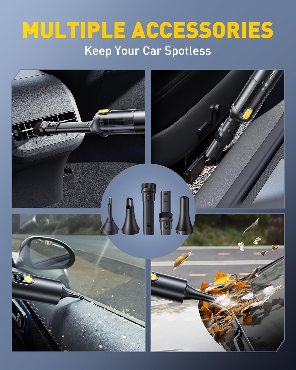 - ă4 IN 1 MULTI-FUNCTIONAL CORDLESS CAR VACUUMăAUXITO Mini Vacuum Car Cleaner is equipped with a variety of nozzles to perfectly meet the different needs of vacuuming, blowing, inflating and pumping. It not only quickly cleans car seats, trunks, floor mats, computer keyboards, sofas, carpets and any hard-to-reach places, but also helps to inflate yoga balls, swimming rings and all inflatable items, and vacuums air for all kinds of vacuum storage bags to save space