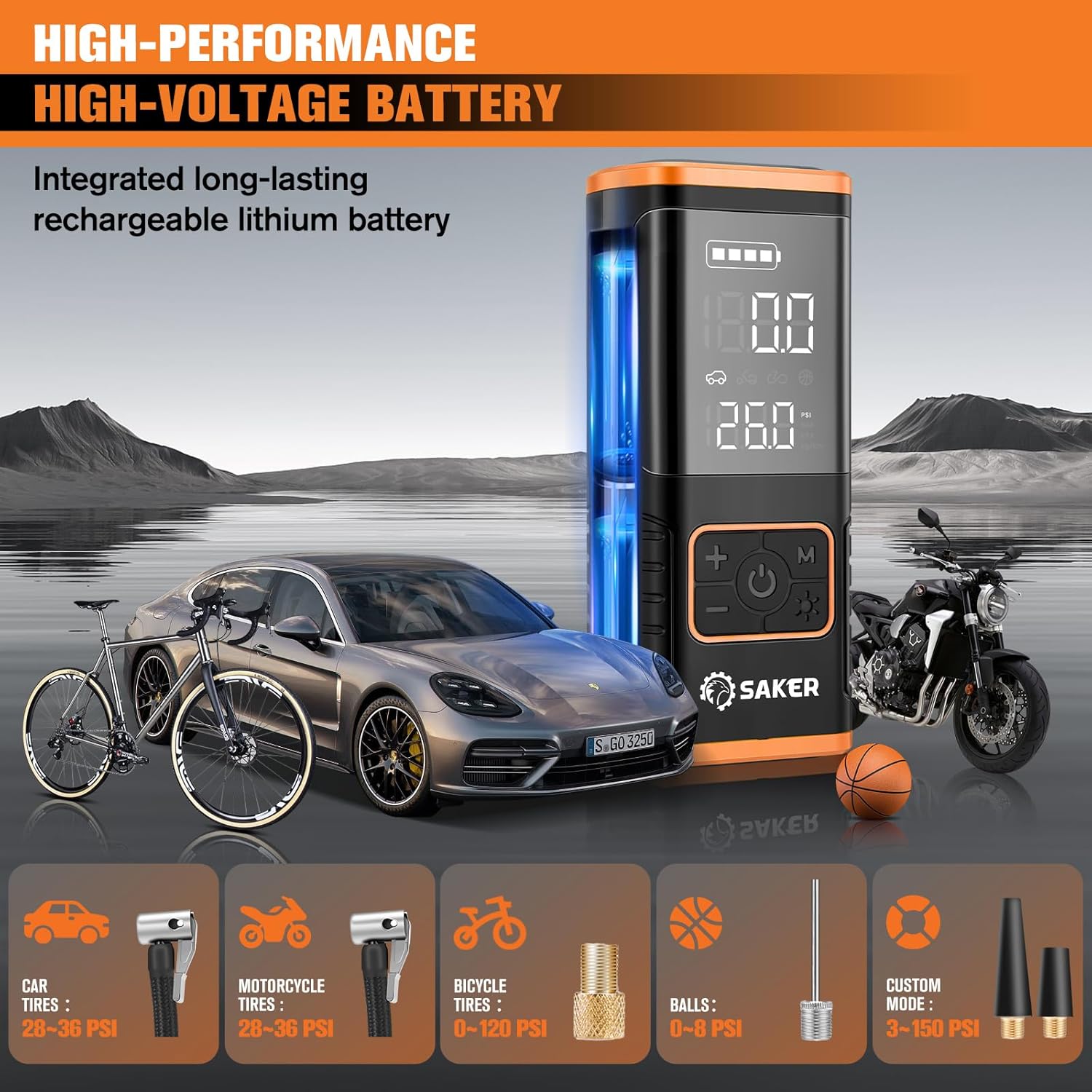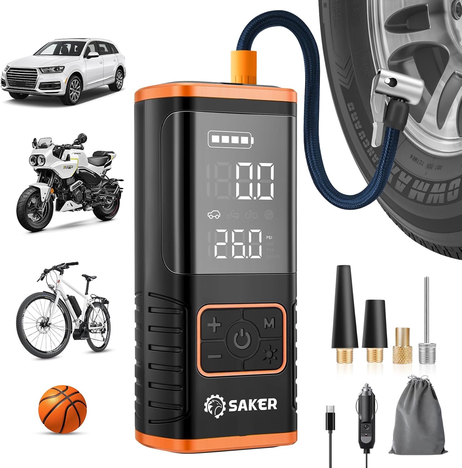 - 【MULTI-FUNCTIONAL AND EMERGENCY FEATURES】Saker air pump for car tires features LED lights with multiple modes (lighting, slow flashing, fast flashing) for nighttime or emergency use. It includes digital displays for battery level and pressure, making operation easy. The 5V/2A USB output port can charge mobile phones and other devices, serving as an emergency power source. This functionality makes the electric air pump practical for everyday use and essential in emergencies.