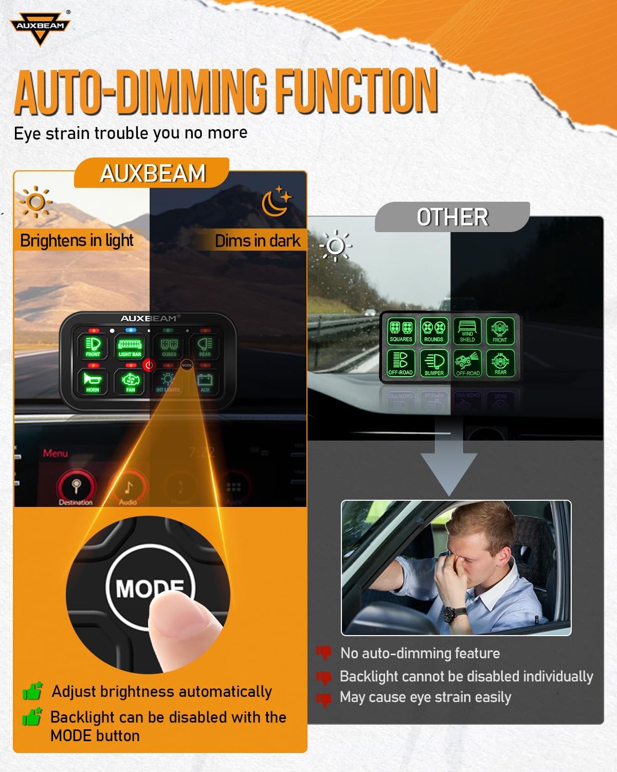 - 【RGB Backlight with Auto-Dimming】: This Auxbeam 8 gang switch panel offers a wide range of RGB backlight color options to suit your car's ambient lighting. With auto-dimming functionality, the backlight adjusts to be bright in daylight and dim at night, reducing eye strain