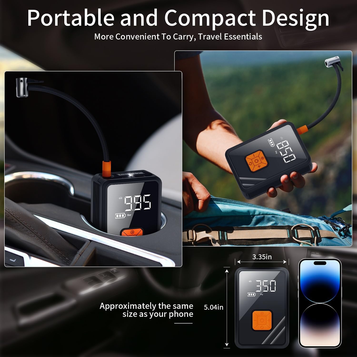- 【Portable & Versatile】This cordless bike air pump is smaller than a mobile phone and weighs only 0.88lb. Our air tire pump for car portable features a compact cordless design, is convenient to carry around and can be easily stored in a car, bike rack, or backpack, making it perfect for travel or home use. It comes with multiple accessories, including a presta valve adapter, inflation nozzle adapter, and ball needle, suitables for cars, motorcycles, mountain bikes, balls. (Note: Incompatible with heavy-duty tires, like those on offroad vehicles, RVs, trucks, and trailers.)