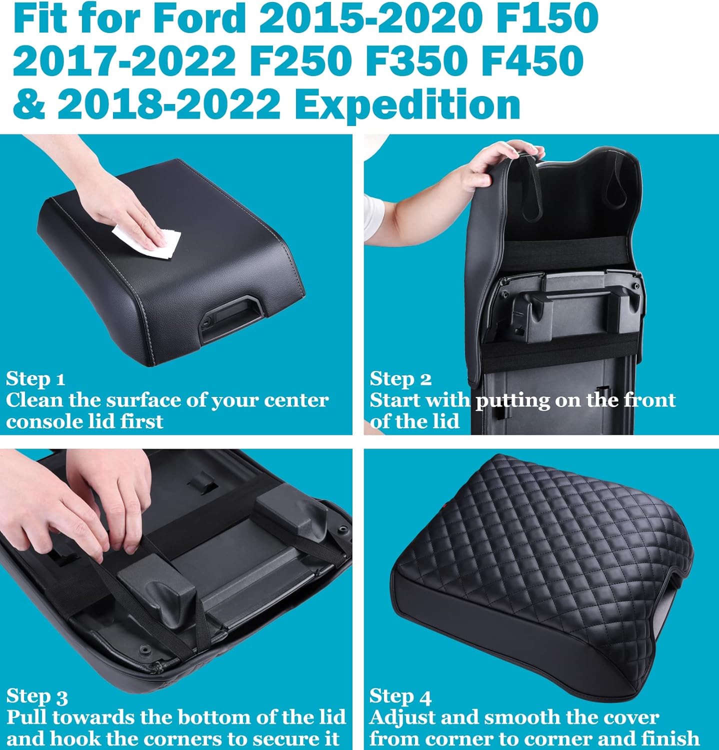 - EXQUISITE WORKMANSHIP -- Our Ford F150 center console cover adopts advanced stitching technology to sew the classic diamond pattern, which makes your car’s armrest box look luxury. The black PU leather cover is like an OEM part that matches perfectly with your car interior, and raises the look of the cab to another level