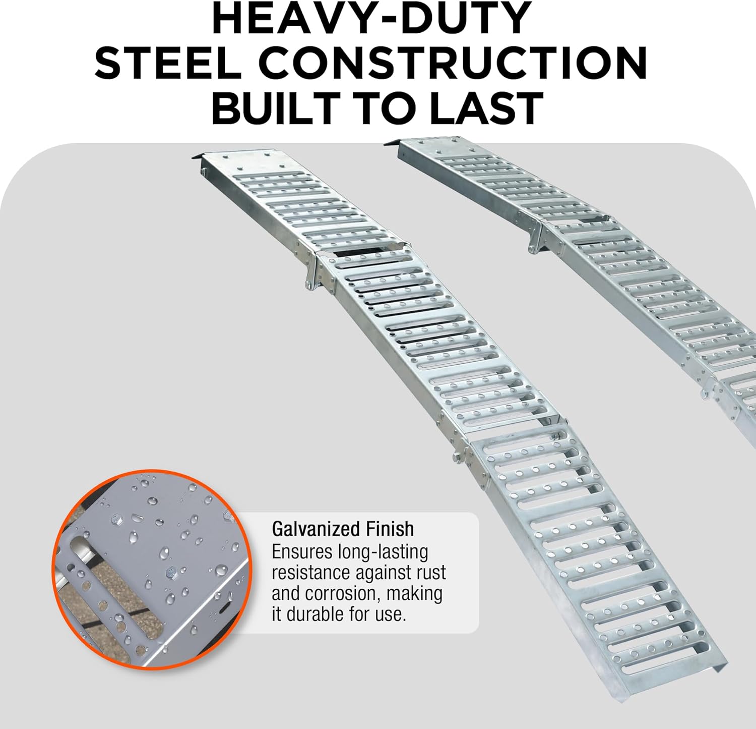 - SECURE ATTACHMENT: Our galvanized finished ramps include with heavy-duty steel safety straps (hinges) to prevent slippage, ensuring a reliable connection to your vehicle for added safety.