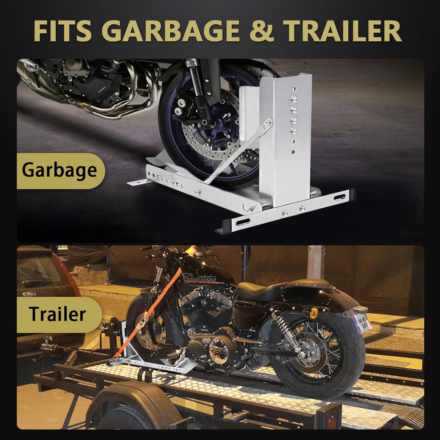 - 2 Ratchet straps:For easy use on trailers, the product comes with two ratchet straps to ensure the motorcycle is held in place while moving