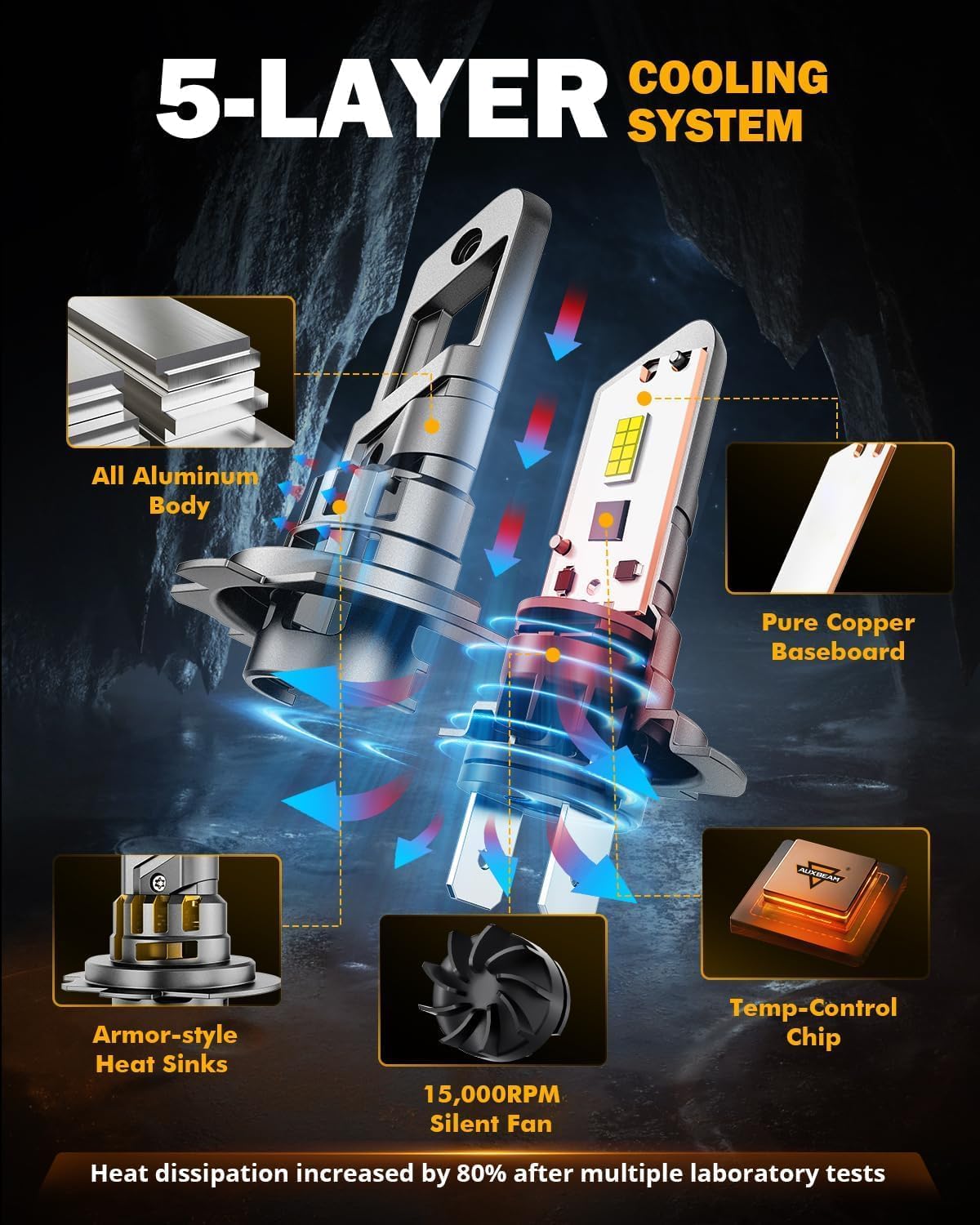- TEMP CONTROL SYSTEM: Joint heat control design. The built-in latest temp control chips, 12,000RPM 9-blade silent fan, pure copper substrates, 6063 aviation aluminum lamp body, multiple heat sinks directly improves 120% heat dissipation, prolonging lifespan of H7 light up to 50,000 hours