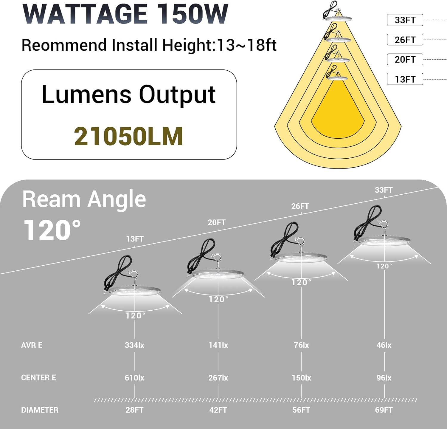 - 【Super Bright】Our 150 watt UFO LED high bay light features 21,050 output lumens, which provide super bright light equivalent to 650W MH/HPS and save your electric charge up to 83%. It uses high quality SMD3030 LED chips with higher CRI and produces clearer, more color-friendly light to reduce eye strain