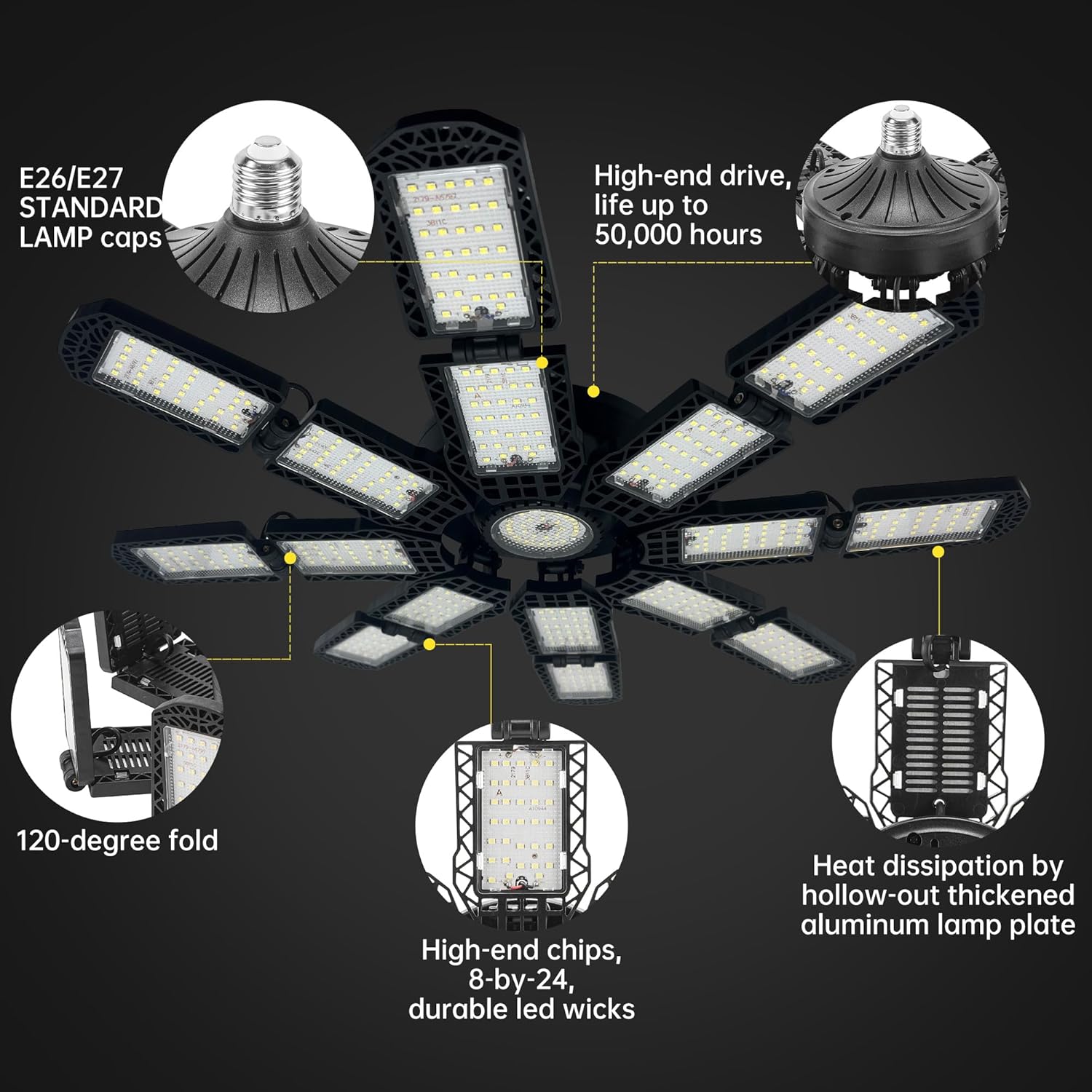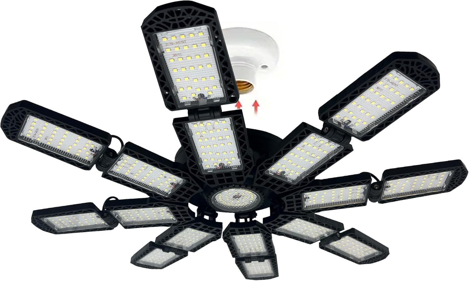 - 【16+1 Deformable Super Bright LED Garage Lights】- With 16+1 ultra-bright adjustable LED pannels. It features with 17*24 PCS top quality diodes that total 25000 lumens, CRI80+, 6500K daylight can give you 85% energy saving for your garage. The upgraded lighting fixtures have sufficient brightness and are the preferred choice for work.