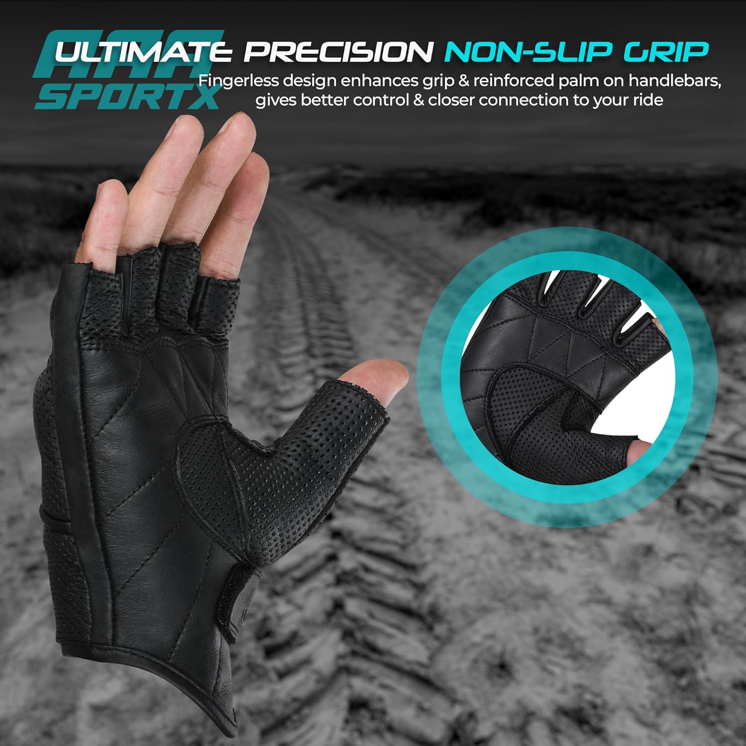 - LEATHER MOTORCYCLE GLOVES - aaasportx Best Fingerless Motorcycle Gloves are made of Genuine Leather. Our Lightweight Motorcycle Gloves ensures durability through a variety of situations. aaasportx Motorcycle Gloves for Men offer a high-quality, stylish, and durable finish that excludes sophistication and toughness on the road.