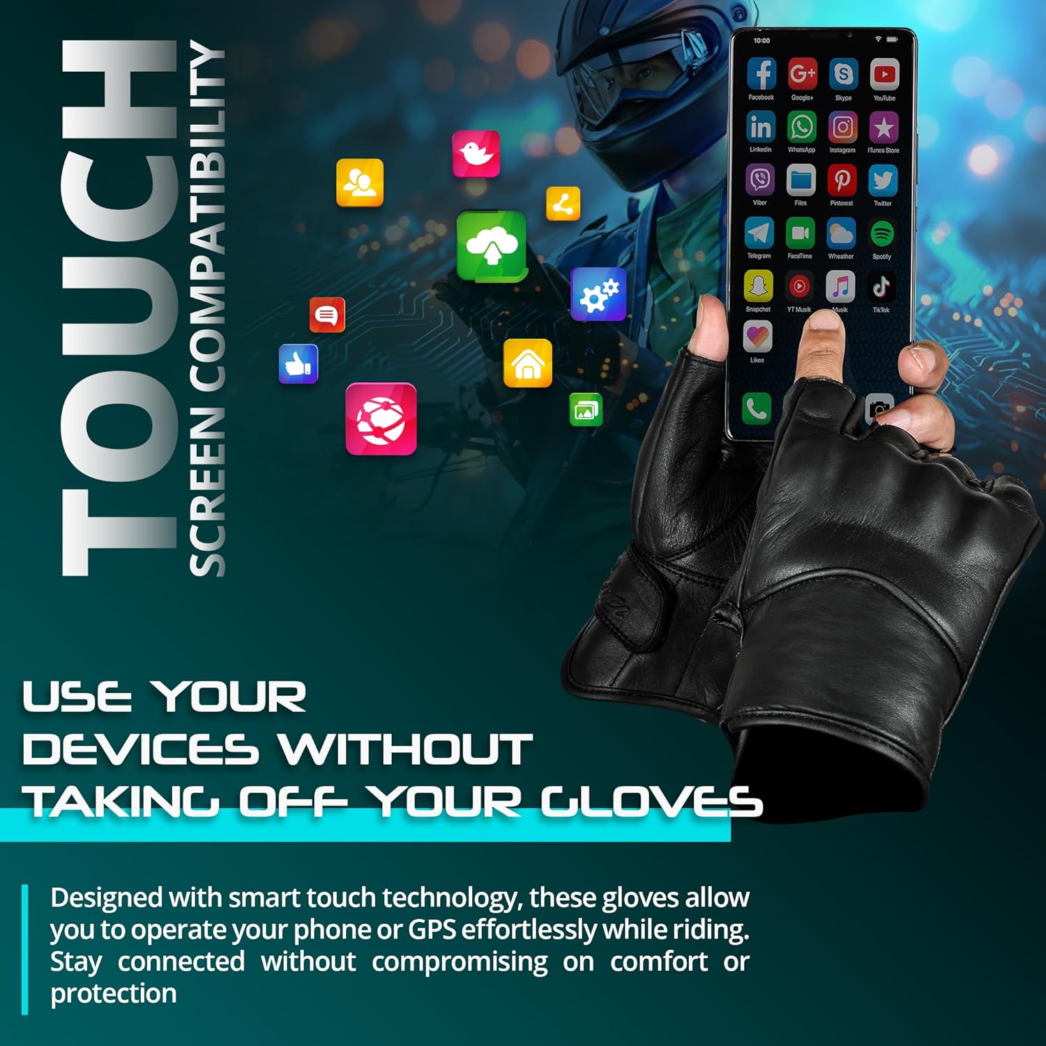 - TOUCHSCREEN MOTORCYCLE GLOVES - aaasportx Motorcycle Gloves Fingerless for Men Touchscreen thumb and forefinger have touch screen capability. The gloves can be used with any number of touch screen devices without the user having to remove the glove. This makes them ideal for outdoor activities. Perfect choice for motorcycle riding, motorbike racing, scooter, driving, snowmobile, off-road, ATV, MTB, Powersports activities.