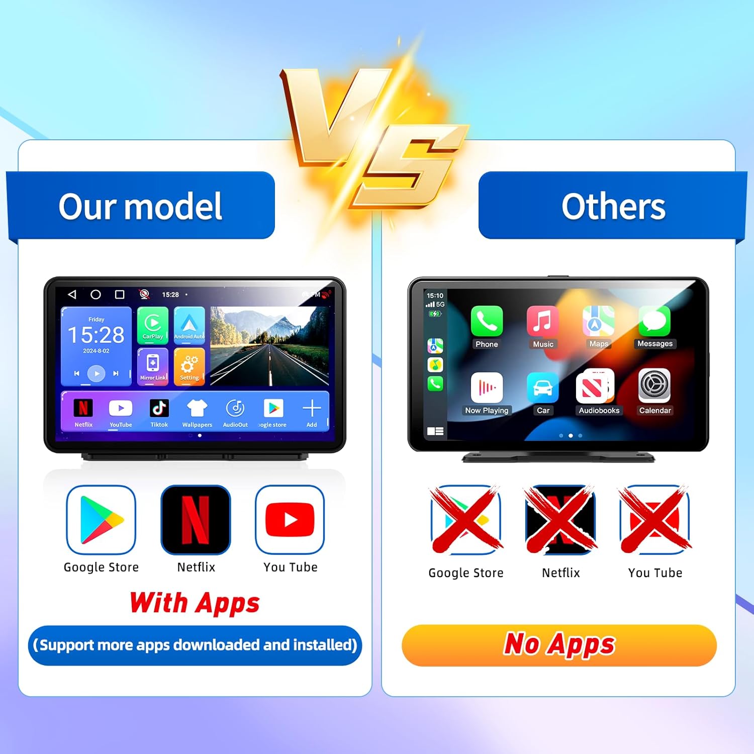 - 🚗 POWERFUL ANDROID SYSTEM: Portable Apple Carplay Car Stereo features a powerful Android system, providing smooth and efficient performance. With access to online browsing and the Google Play Store, users can easily download apps, stream content, and enjoy a wide range of entertainment options. Additionally, the system supports offline maps, ensuring reliable navigation even without an internet connection