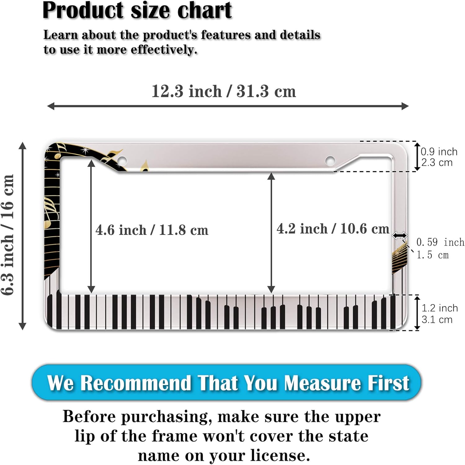 - STANDARD FRAME SIZE: Ensure a perfect fit by checking the dimensions to avoid covering your state name. These frames are specifically designed to fit standard American license plates measuring approximately 12.3" x 6.3" (16 x 31 cm). for most license plates in the U.S.