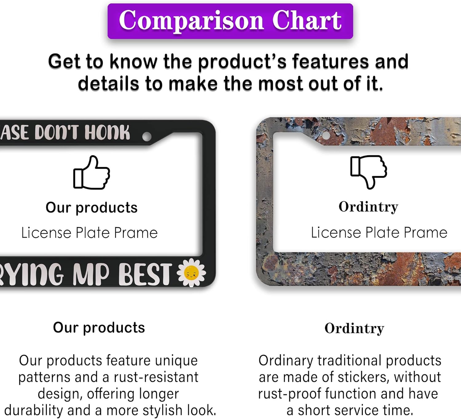 - FUNNY DESIGN: Featuring a unique and customized design, this license plate frame creates an eye-catching and bold statement for your vehicle. Not only does it add a touch of personality to your car, but it also makes for a great holiday gift, souvenir, or decorative piece for family, friends, and colleagues. Elevate your vehicle's style while sharing a laugh!