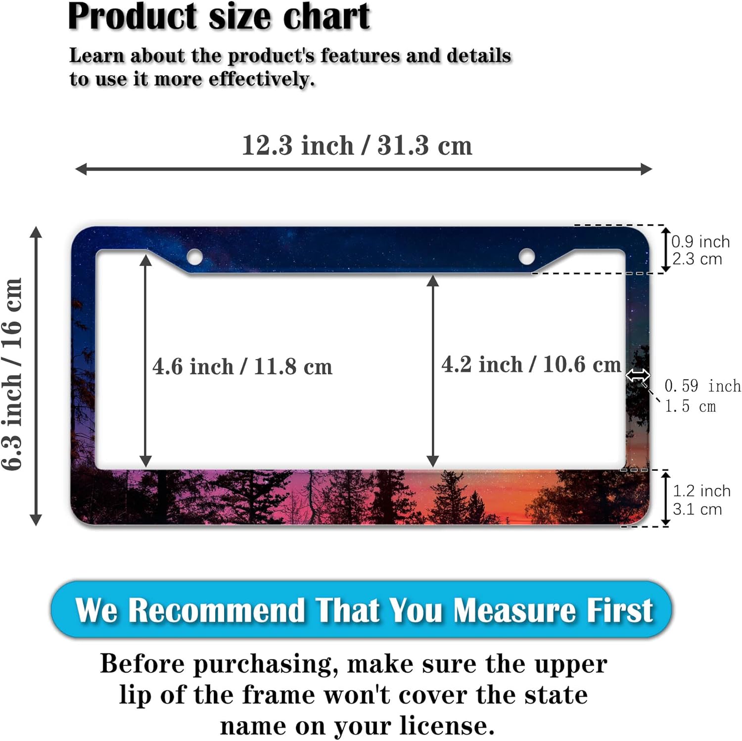 - STANDARD FRAME SIZE: Ensure a perfect fit by checking the dimensions to avoid covering your state name. These frames are specifically designed to fit standard American license plates measuring approximately 12.3" x 6.3" (16 x 31 cm). for most license plates in the U.S.