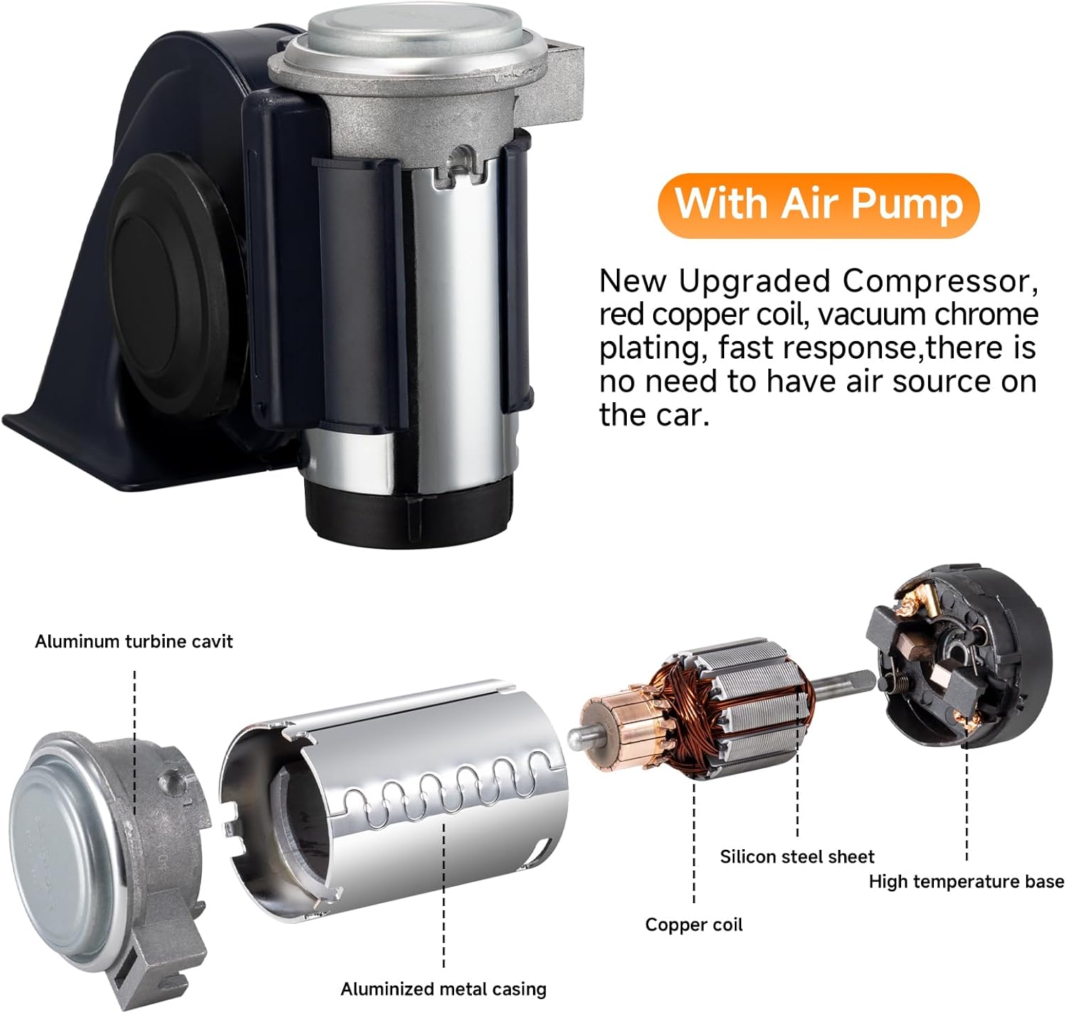 - 【Innovative Design】: Our air horn features an extremely powerful directly injected mini-compressor paired with a snail design, up to 150DB ! The sound is harmonious, loud enough, and the sound quality is excellent. All integrated into one small but powerful device