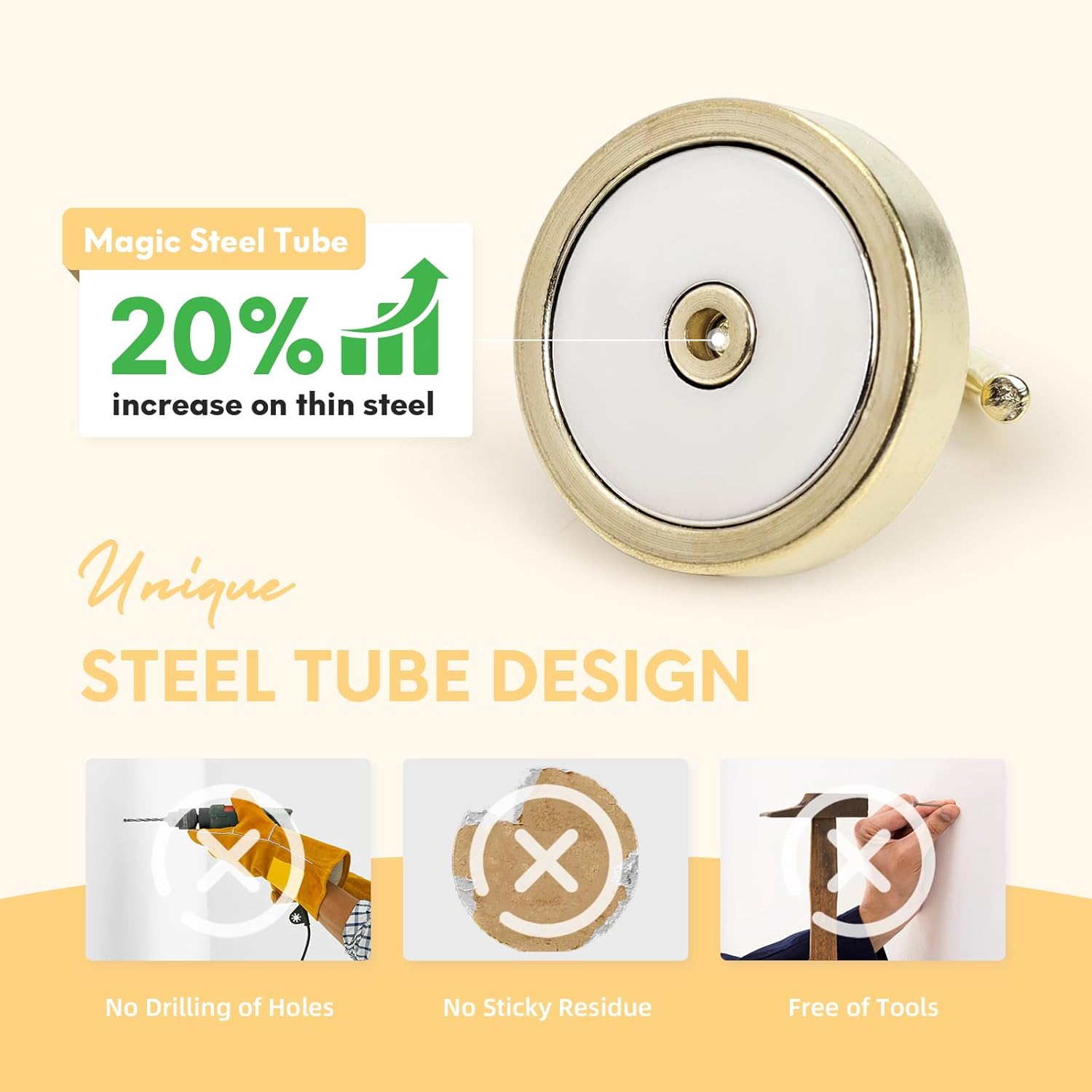 - โMAGIC STEEL TUBE DESIGN - Unique design of steel tube inside the base of magnetic hooks greatly increases the attractive force , especially on thin steel! It increase approximately 20% force comparing those none-tube magnets. it solves the problem of weak force on thin steel. Permanent magnetic hook with magic steel tube, strong magnetism lasts forever!
