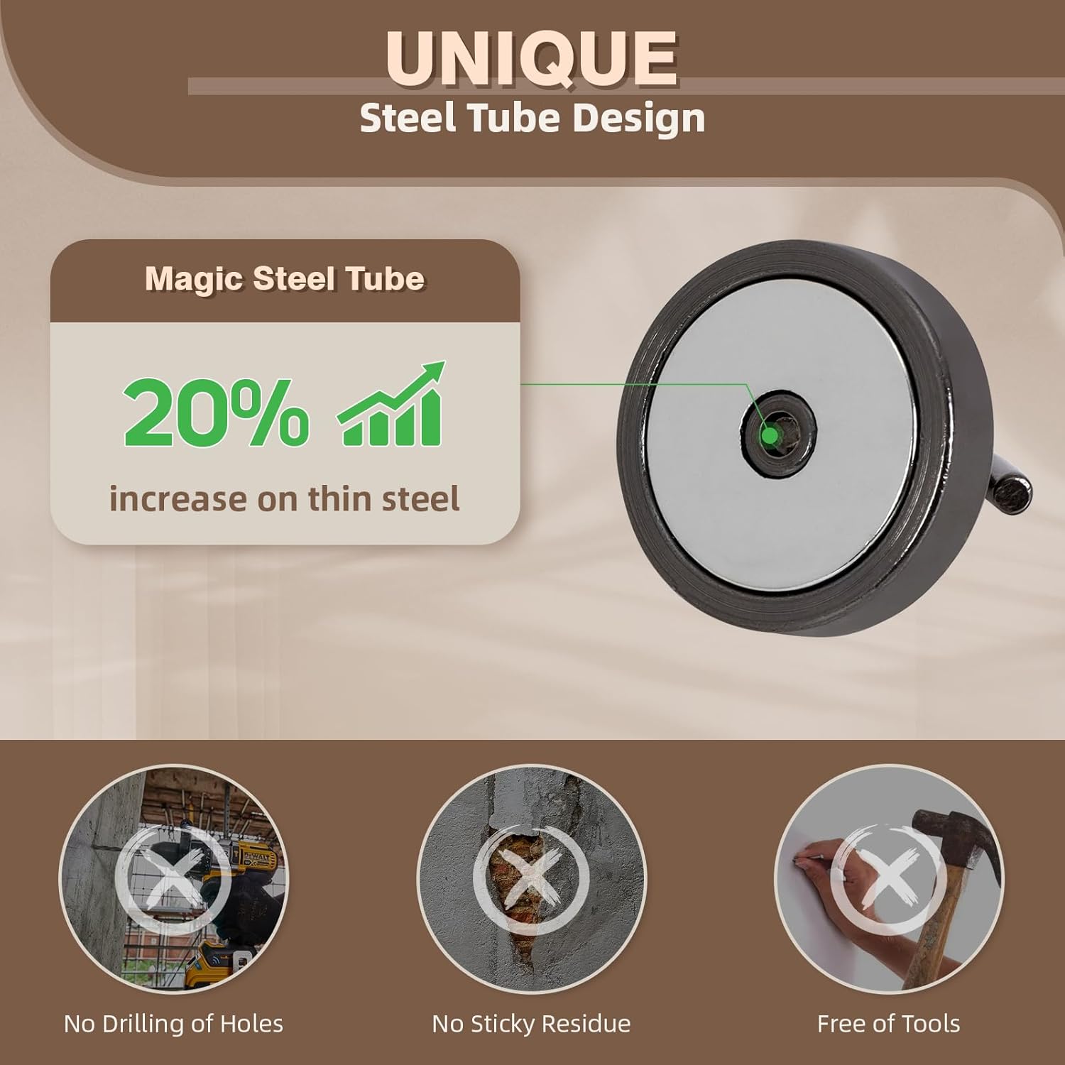- โMAGIC STEEL TUBE DESIGN - Unique design of steel tube inside the base of magnetic hooks greatly increases the attractive force , especially on thin steel! It increase approximately 20% force comparing those none-tube magnets. it solves the problem of weak force on thin steel. Permanent magnetic hook with magic steel tube, strong magnetism lasts forever!