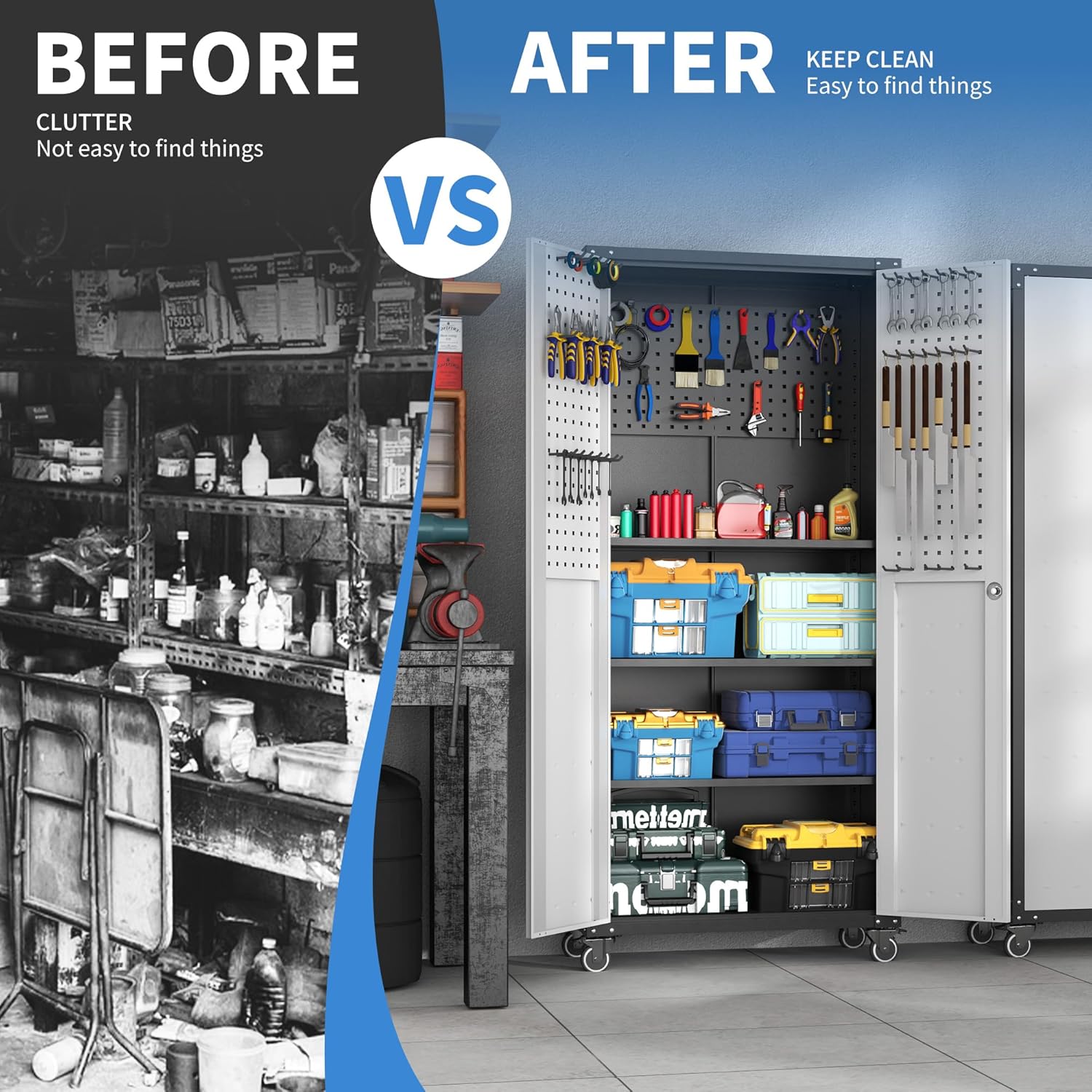 - Adjustable Shelves: This metal garage storage cabinet comes with 3 adjustable shelves and 2 tool pegboard that can be adjusted to different heights depending on the height of the items. The 2 tool pegboard can be hung inside the tool cabinet or on the wall, both of which are able to organise your tools effectively.