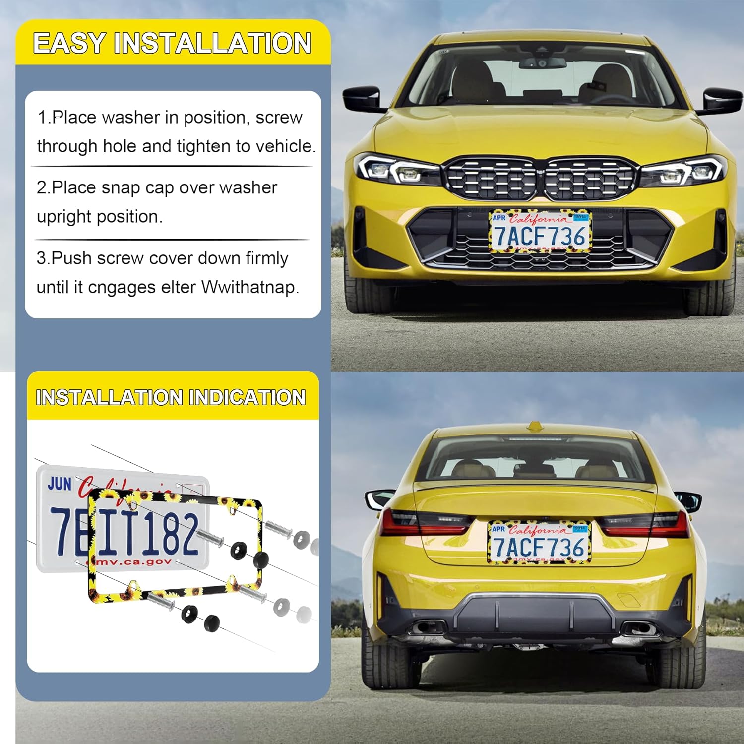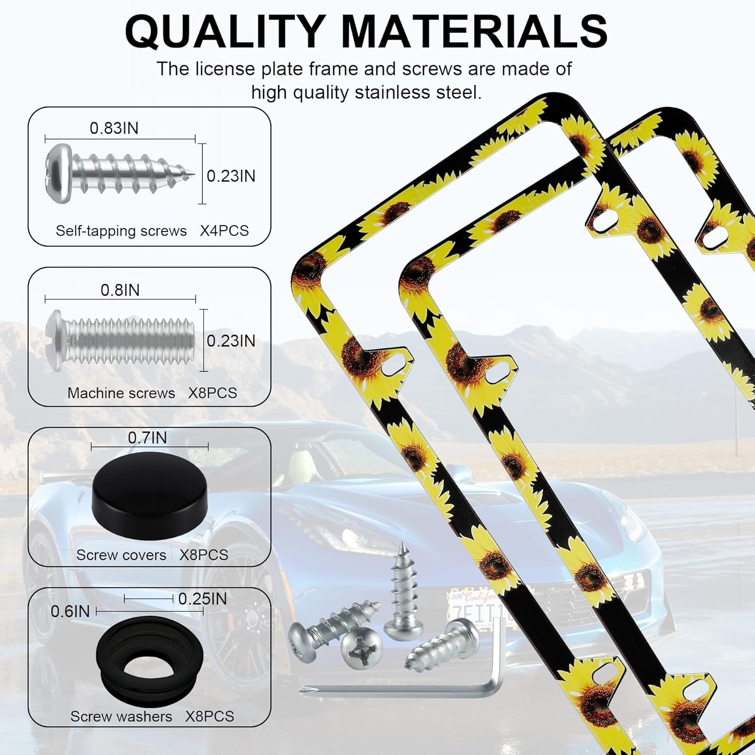 LivTee Flower License Plate Frames, 4 Holes Stainless Steel License Plate Covers, 2PCS Car License Plate Holder, Automotive Exterior Accessories, Sunflower