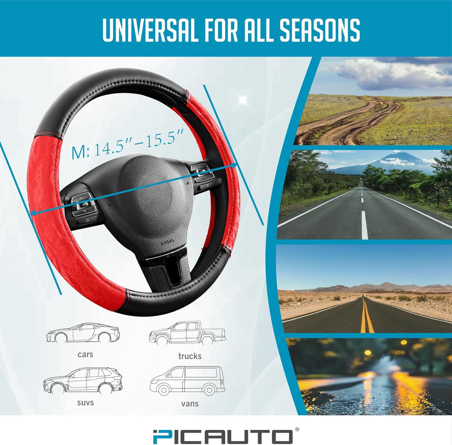 PIC AUTO Steering Wheel Cover, Silk Grain Leather Car Steering Wheel Protector, Comfortable Grip, Universal 14.5-15.5 Inch Anti-Slip Steering Wheels Accessories for Men & Women (Red)