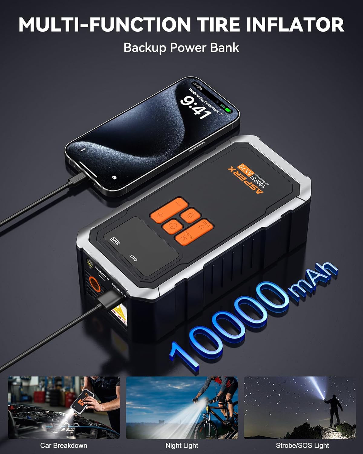 - 【Cordless Freedom & Carry Case】Say goodbye to messy cords! The rechargeable portable air pump runs 25+ minutes per charge – inflate 8-10 car tires or 15+ bike tires effortlessly. The AsperX Carrying Case is made out of an extremely tough material, exhibiting outstanding cut and tear resistance. Compact design fits in any trunk for emergency tire inflator for car readiness.