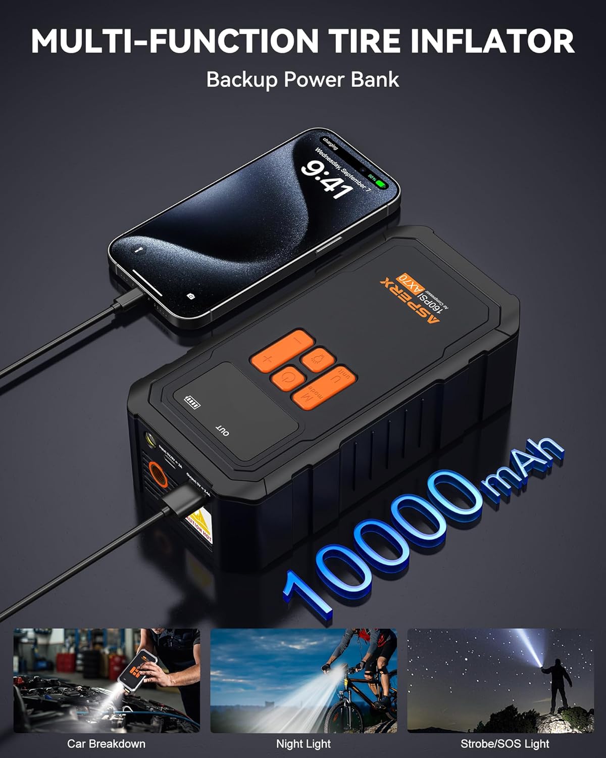 - 【Upgrade 160PSI & 3X Faster Tire Inflator】Built with the highest quality materials and equipped with a 10000mAh powerful battery, accuracy up to 160 PSI. AsperX is a portable tire inflator for car, trucks, SUVs, motorcycles, and bicycles. Which fill a small car tire up (25-36PSI) in 1 minute in everyday situations or fully inflate car tires (0-36PSI) in just 8 minutes.