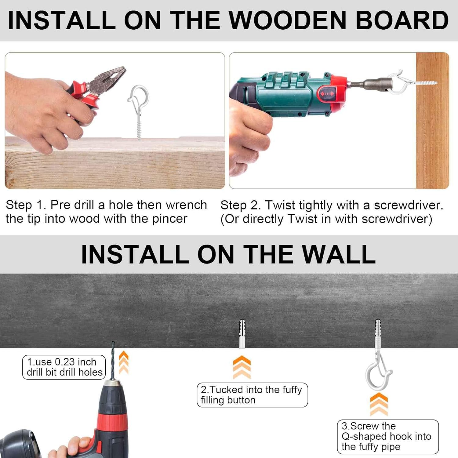 - Easy To Install - Come with plastic tubes, swivel hooks for hanging are easy to install all solid surface such as walls, ceiling, wooden beams, tree, fence, eaves etc. You can pre drill a hole then wrench the string light hooks outdoor directly in.