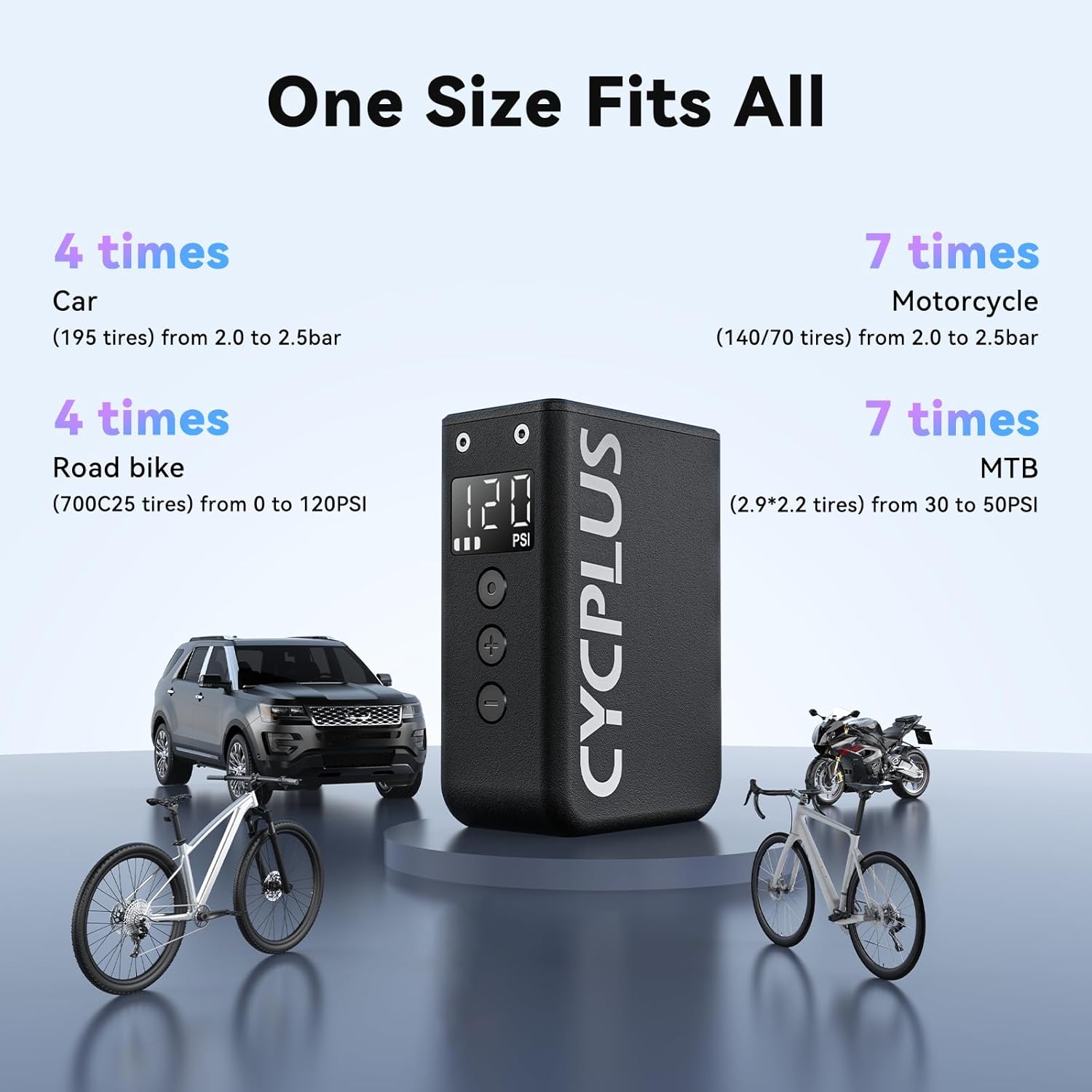 - 【Fast Charging】Only one hour to be fully charged. With a full charge, it can inflate at least THREE 700*25C tires from 0 to 120 PSI.
