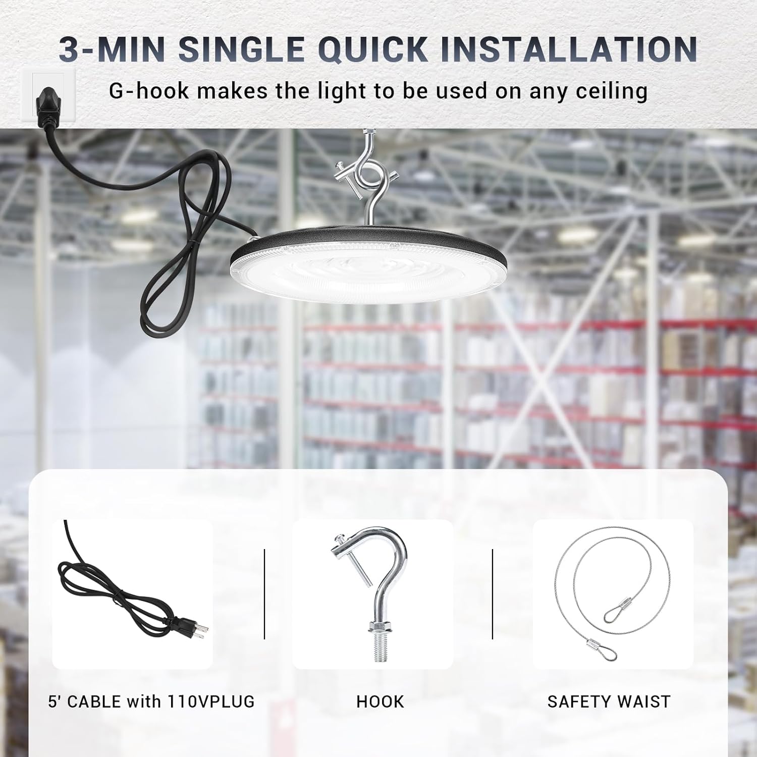 - 【Easy & Quick Installation】This UFO Led High Bay Light can be easily installed in seconds with the 5FT power cord provided and the built-in hook. It comes with US plug with which you can plug to the power directly, safe and secure for extremely easy installation. Ideal indoor lighting,This LED highbay light can work under power supply of AC 120V.