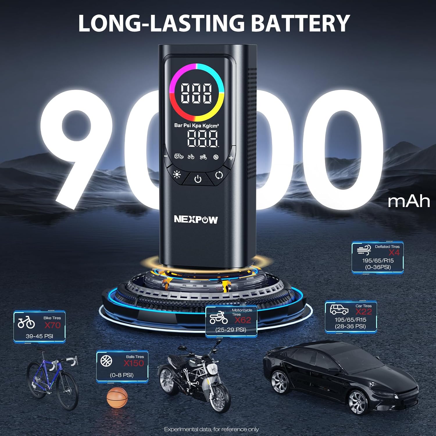 Tire Inflator Portable Air Compressor, NEXPOW 150PSI & 9000mAh Cordless Air Pump with Digital Tire Pressure Gauge, Accurate Dual LCD Display & LED Light, Tire Inflator for Car,Motorcycle,Bike,Balls