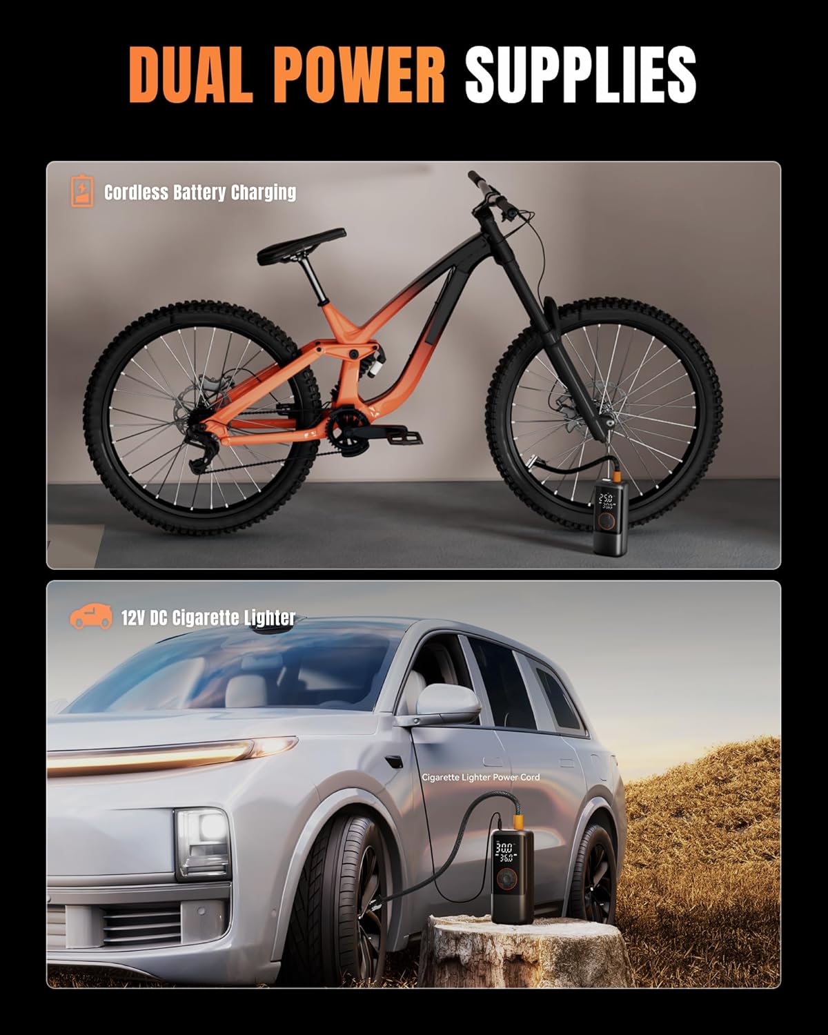- 【4X &150PSI】 Cordless Bike Pump With Tire Pressure Gauge Is Equipped With A High-Performance Chip, Offering 150 Psi Air Pressure. In Less Than 1 Minute, It Can Quickly Increase Tire Pressure From 29 Psi To 36 Psi. With Lightning Speed, This Tire Pump Easily Handles Various Inflation Challenges.