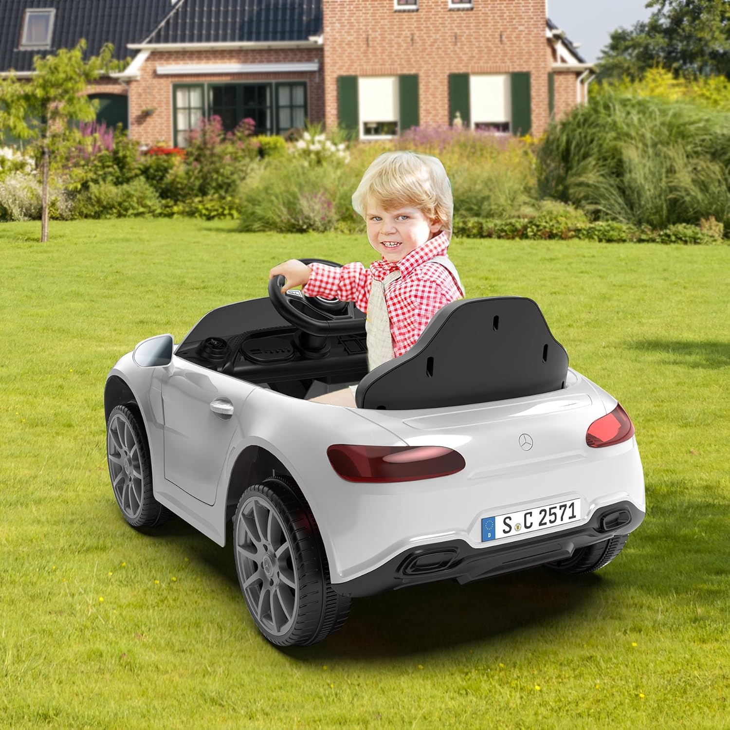 - More Functions: Built-in music and USB port to play your own music, there is a horn on the steering wheel, forward/backward, turn right/left, brake freely; Speed shifting and real car engine sound.Double drive big battery,speed up to 3km/h.