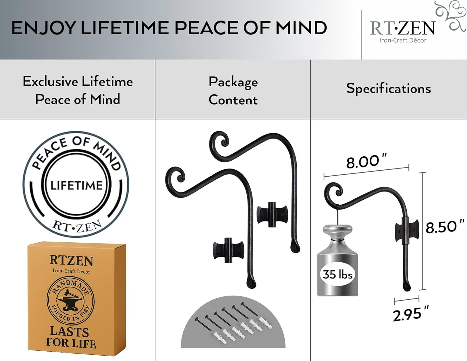 RTZEN Plant Hangers Outdoor or Indoor - Wrought Iron Metal Hanger Indoor Hook - Heavy Duty Wall Bracket Hooks for Hanging Plants Baskets Lanterns Wind Chimes - 2 Pack (Black Axe-Shape Hooks)