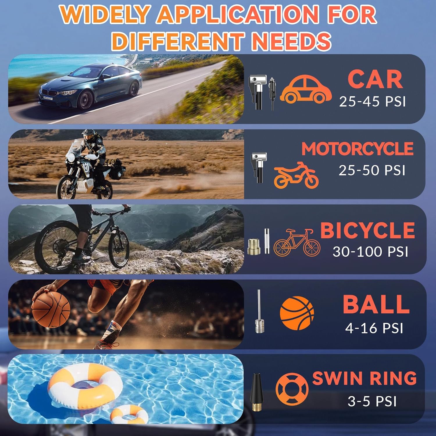 - Portable and Package: We offering a warranty period of 12 months as per our commitment. This 12V air compressor has a storage bag that can be easily stored in your car, bike rack, motorcycle or backpack. Package Including: 1 X Tire inflator portable air compressor, 1 X Pump tube, 1X DC 12V Cigarette lighter charging cable,1 X USB-A to USB-C cable, 5 X Air nozzle, 1 X User manual. And it is also a ideal gift for Father's Day, Boy's birthday and Christmas